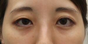 一見すると開瞼は良好に戻ってパッチリしています。右のラインはちょっと内側が広くなってお喜びでした。しかも内側の開瞼も向上して見えます。左のラインも内側を挙げましたが、程度の問題です。目を開いているとそんなに目立たないのですが、下向きでは二本線が段違い平行棒になり、閉じるとずれているのが見え見えでした。ちなみに右眼瞼のラインも閉じると段違い平行棒ですが、目を閉じている状態は気にならないそうです。