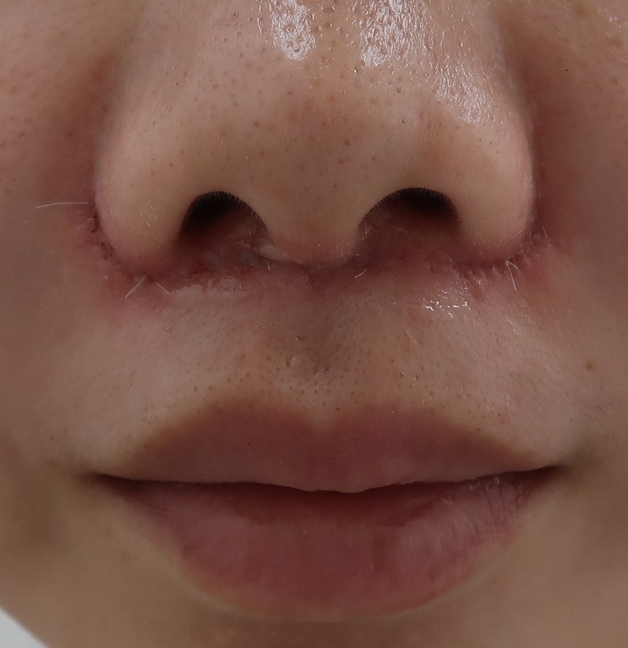 公開日時: 2019年5月30日884 × 912 (人中部白唇短縮術は両側鼻翼下間を同じ幅で切除します。真皮縫合が命!。実は丁寧に時間をかけるしかありません。)