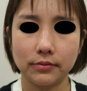 術前の正面像。咬筋は痩せました。Jowl はマリオネットラインの横の下顎縁が膨らんでいる部分です。