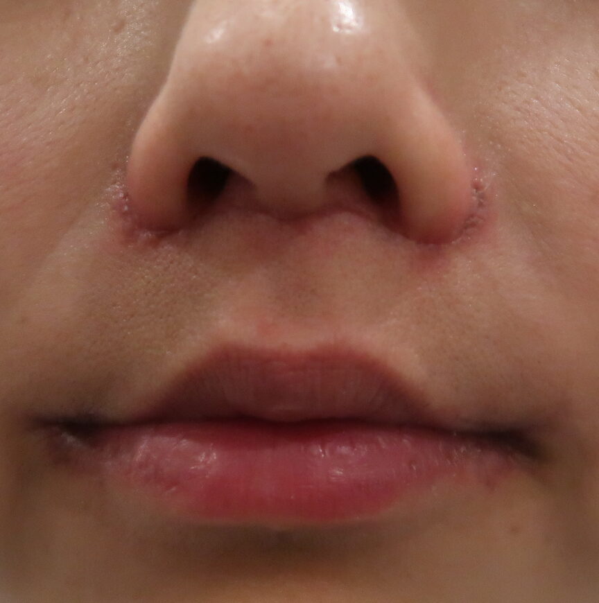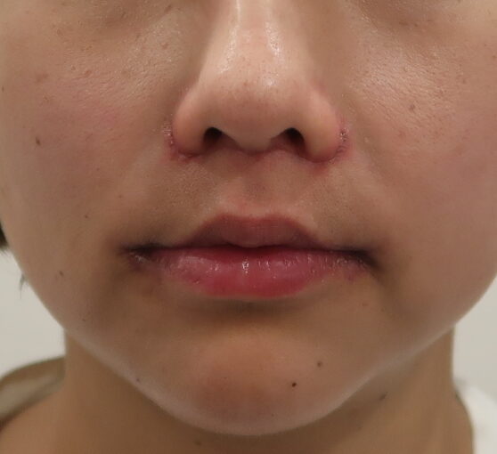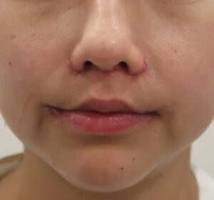 術後1週間で両側鼻翼間と口角は抜糸しました。周囲に少々の内出血が露見していますが、形態は解りますし、傷跡は赤い線ですが、早晩白くなります。幅も広がらない様に丁寧に真皮縫合しました。