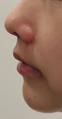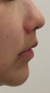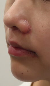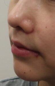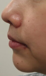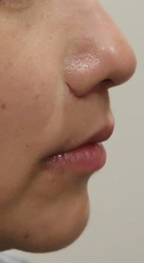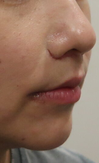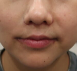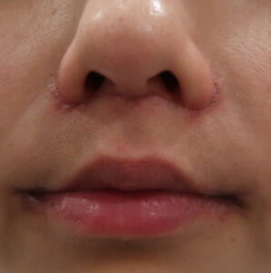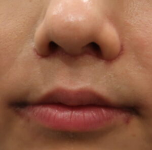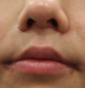 実はその後、両側鼻柱基部と人中陵に真皮縫合の糸を架けています。透明の糸ですが、左は赤唇前に見えますね。