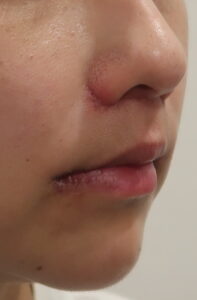 上左図は全体を真皮縫合。全部で18針もです。傷の全長は約4㎝ですから、2.5㎜間隔程度です。上右図は皮膚縫合後です。鼻の皮膚と白唇の皮膚は厚さが違い。また、面の方向が約90度で癒合させる為、皮膚縫合で細かく合わせます。