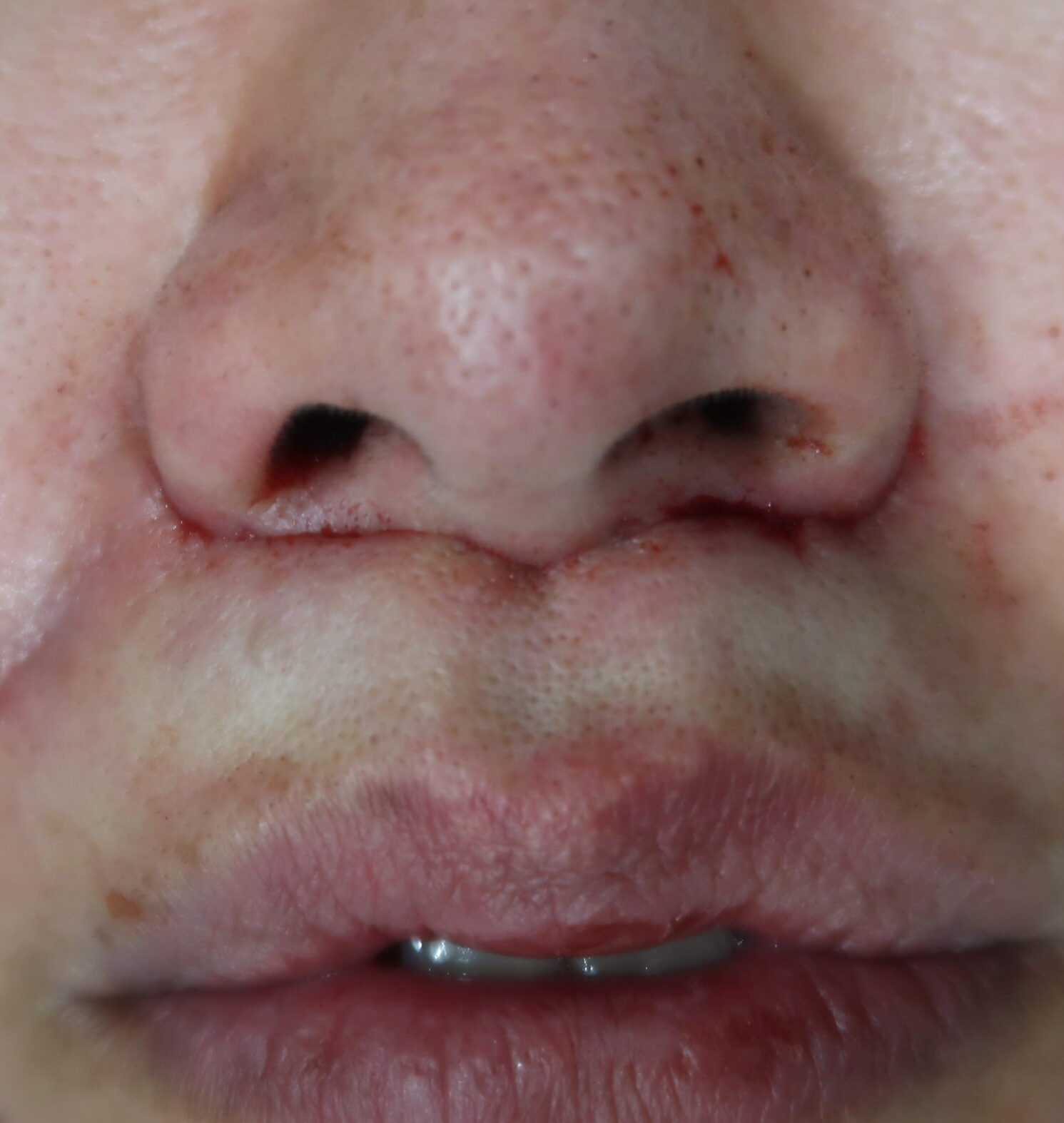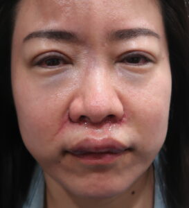 翌日から48時間までは、腫脹が亢進します。赤唇まで腫れています。また、鼻翼が横にも下にも引かれています。腫脹の為ですが、鼻翼を内側に寄せる口輪筋と、上に挙げる上唇鼻翼挙筋が働いていないからです。術後のダメージと腫脹で筋が働かないからです。人は表情筋作用が強く、覚醒して活動時には、トーヌスと言って微弱な信号が筋を作用させています。ですから神経と筋が回復する術後1〜4週間で必ず鼻翼の位置は戻ります。