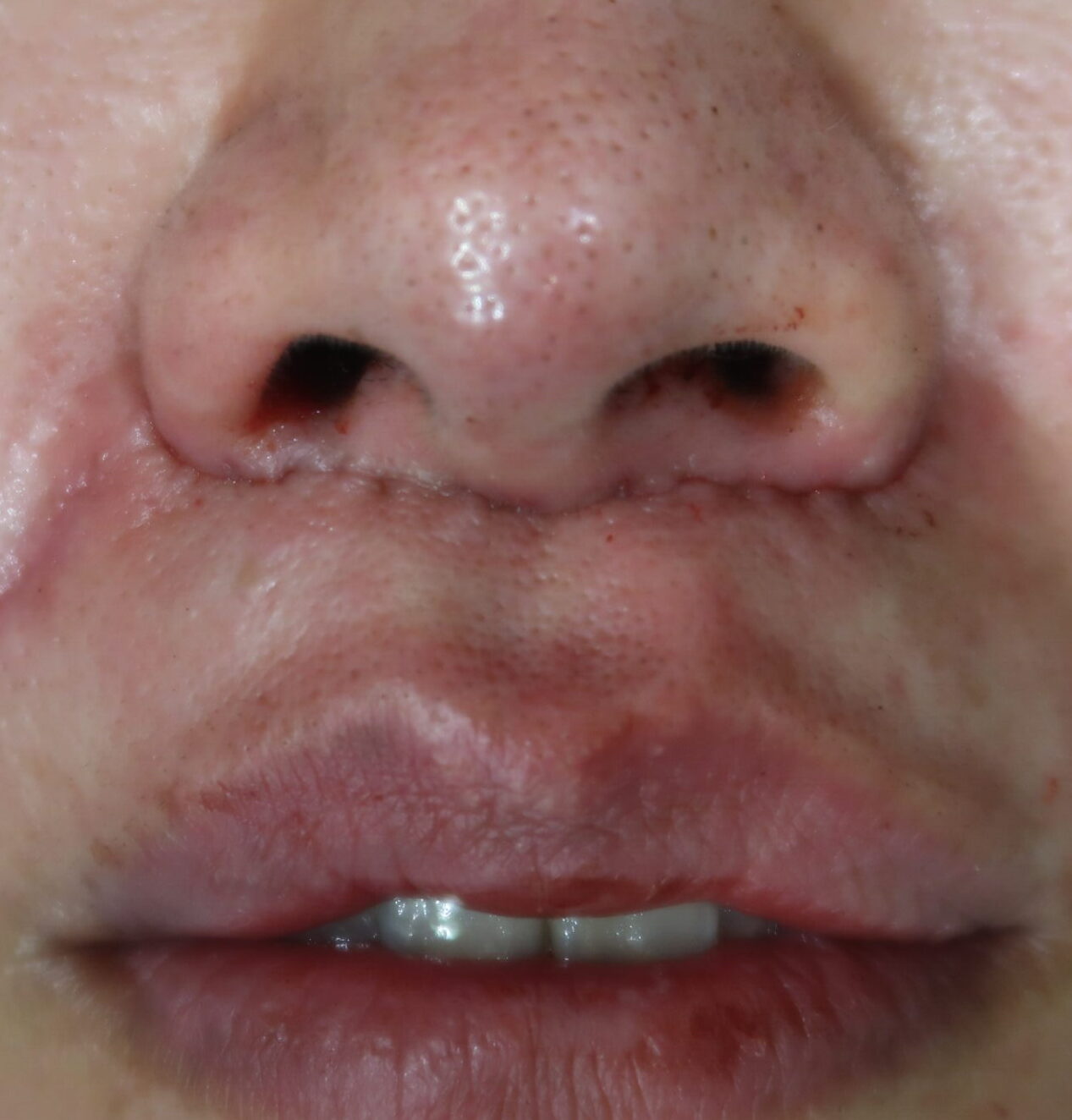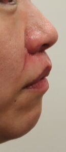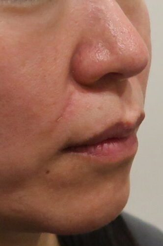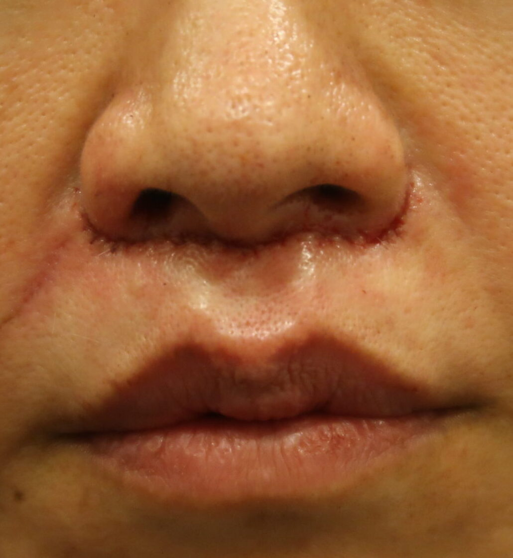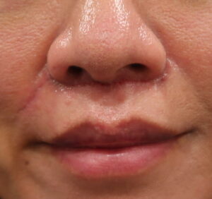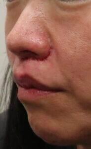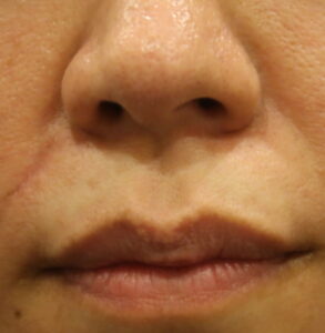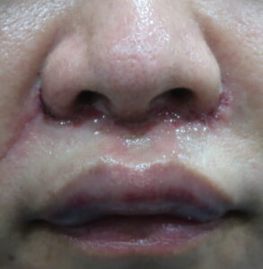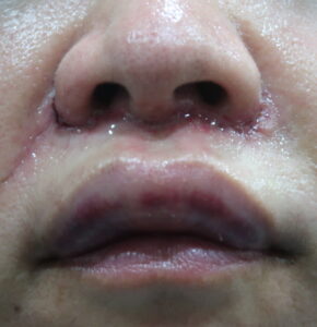 その前に、右鼻唇溝部の他院での黒子をCO2LASERで3回焼いた跡が目立ち、取り残しがあり得るので、部位が近いのであらかじめ切除生検して、約1ヶ月は待って腫脹が治って、形態が整ってから、口唇の手術に到る順番としました。画像で創痕の赤い線は見えます。