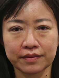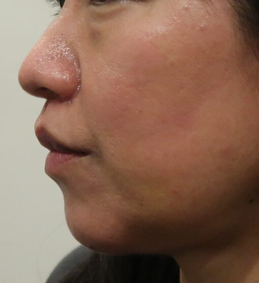 左側のJowlの腫脹は、えら付近まで流れたそうです。やっと引き始めたそうです。画像を比較して確認しました。来週にはもっと減ります。E-ラインが口が出ていないのは患者さんも認識していました。でも赤唇結節が前向きになったら少し口が前へ出ました。患者さんはこれを喜んでいます。また、C-カールも認識されました。実際には腫脹が強い時期は形態的評価は難しいのですが・・。