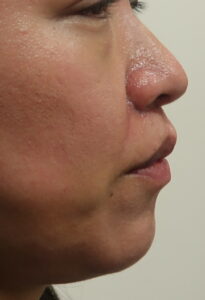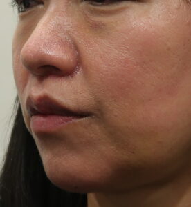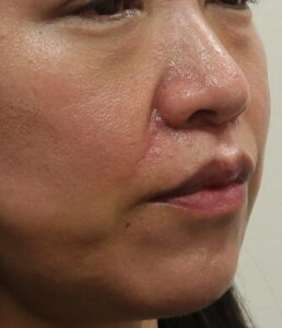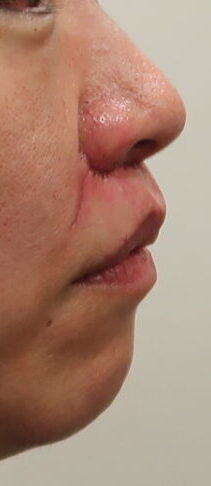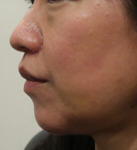 術後1週間の近接画像です。右鼻翼横の鼻唇溝の上方の三角形の陥凹部のドッグイヤーを指摘されました。画像を診ると、黒子をCO2LASERで焼いた跡をスピンドルに切除縫合した上端のドッグイヤーがわずかにありました。その上今回の右鼻翼横の小さなドッグイヤーが合体した模様です。腫脹も関与します。次週診て縮小しないなら、いずれはまたCO2LASERで焼き潰すことができることを示唆しました。