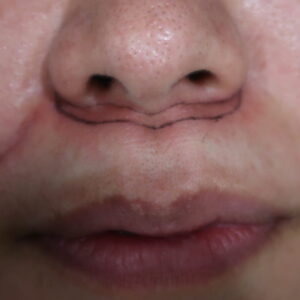 人中短縮術との術名は、非形成外科医と漢字が読めない韓国人が使います。間違いです。人中だけを短縮したら、富士山型となるに決まっています。私は上白唇短縮術と呼びます。ついでに言えば、口唇は赤い部位だけでなく、鼻の下の皮膚もです。赤唇と白唇と呼びます。そうでなければ口唇裂の治療が出来ませんよね?!。そうです。口周りの手術は形成外科医の十八番の筈です。