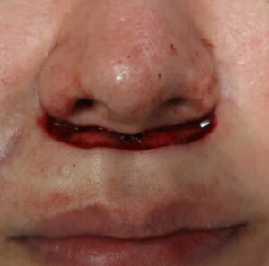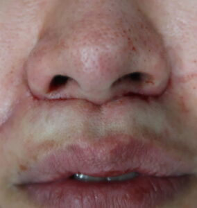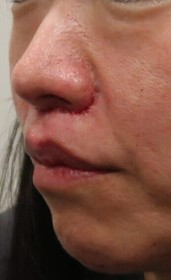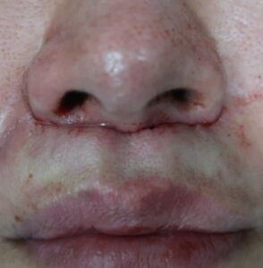 上記と合わせて、真皮縫合を全部で18針したら、引っ張ってみても隙間が全くありません。続いて上右図は皮膚連続縫合後。真皮縫合後に隙間はないのですが、何しろ鼻側と唇側の皮膚は厚さが違う為、ずれて段差になり得るから、皮膚縫合で合わせます。手術終了。