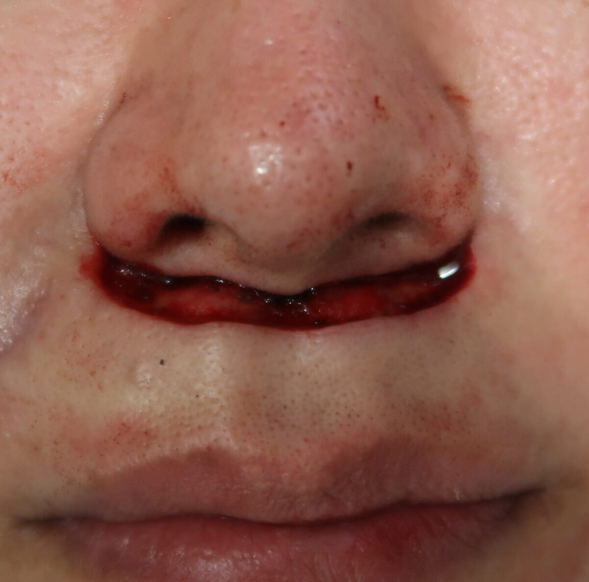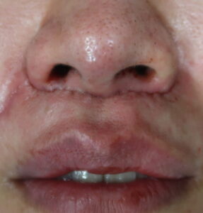 口輪筋は全て残してます。これを縦に縫い縮めたのが上左図。4㎜の隙間が半分になりました。上右図はその後、鼻翼基部を垂直方向に真皮縫合し、鼻翼横の傷も、上手く辻褄を合わせて真皮縫合しました。鼻翼横の創縁は内外で長さが違う為、合わせるに苦労します。図ではプリーツがありませんし、ドッグイヤーも生じていません。