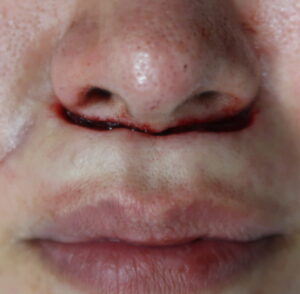 いくつかのポイントがあります。1、両側鼻翼間を全て同じ幅切除して富士山型を防ぐ事。2、口輪筋を切除したら口唇神経を痛めるから縫縮に留める。それでC-カールも造れる。3、鼻翼横の傷は創縁が違うので、辻褄を合わせて”真皮縫合”する。4、鼻柱基部で寄せるかは社会的な態様(女性性を強調するならキスシーンの唇を好む傾向)により選ぶ。5、美容形成外科手術の中でも、顔の前を切る縫う数少ない手術です。真皮縫合を細かく多くして、引っ張っても隙間が出来ないほど、縫う。6、皮膚縫合は創縁の厚さを合わせる。細かく縫う為には連続縫合が適応。