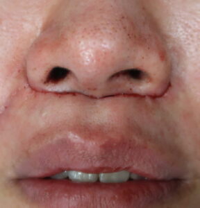 手術当日確認します。両側鼻翼間を鼻孔底隆起堤(明瞭です)の直下で4㎜切除。多めに1.5㎜ずつ寄せましょう。