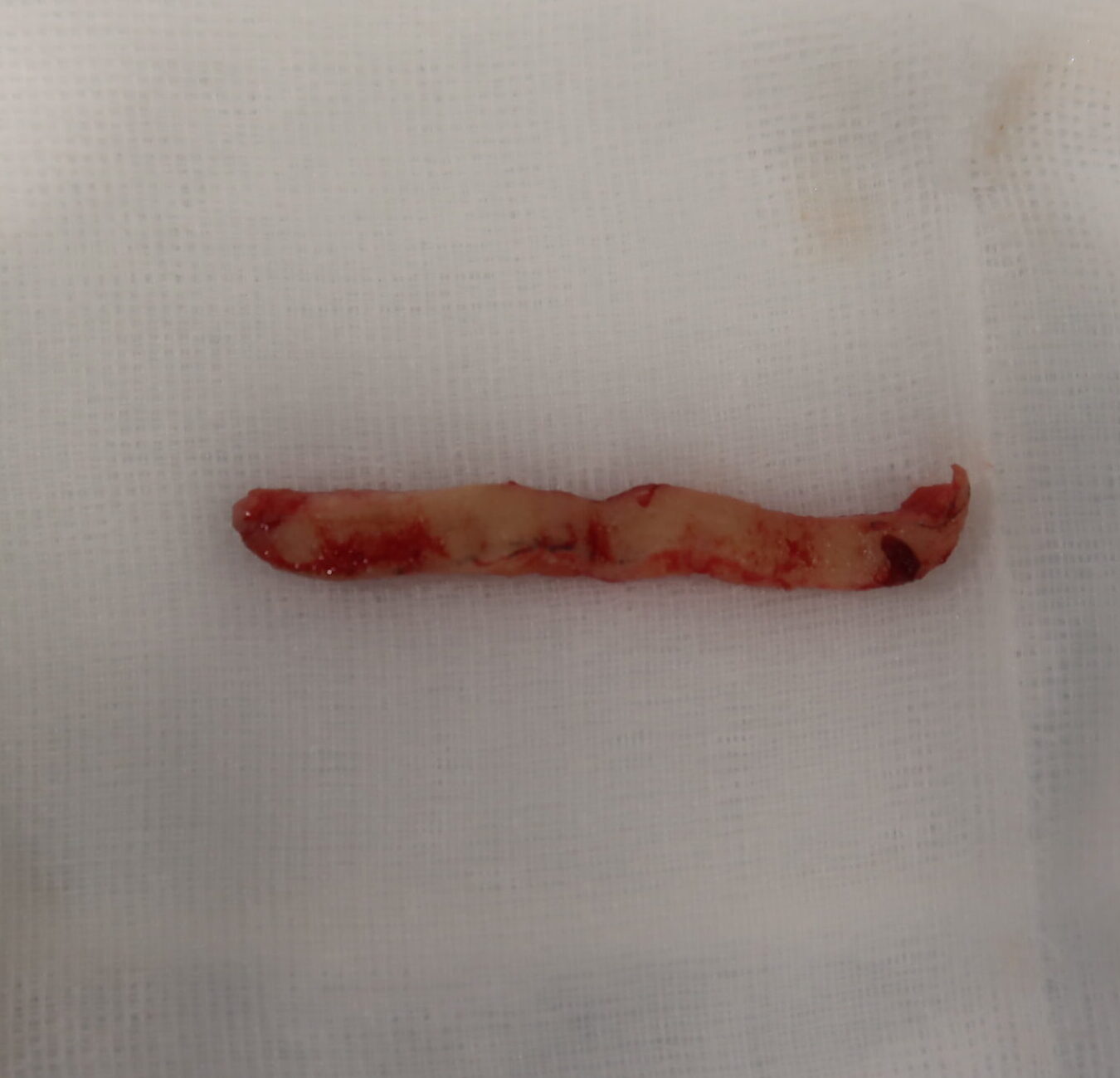 手術を始めます。上左図はデザイン通りに皮膚皮下組織を切除しました。上右図が切除物です。
