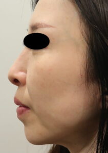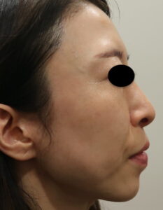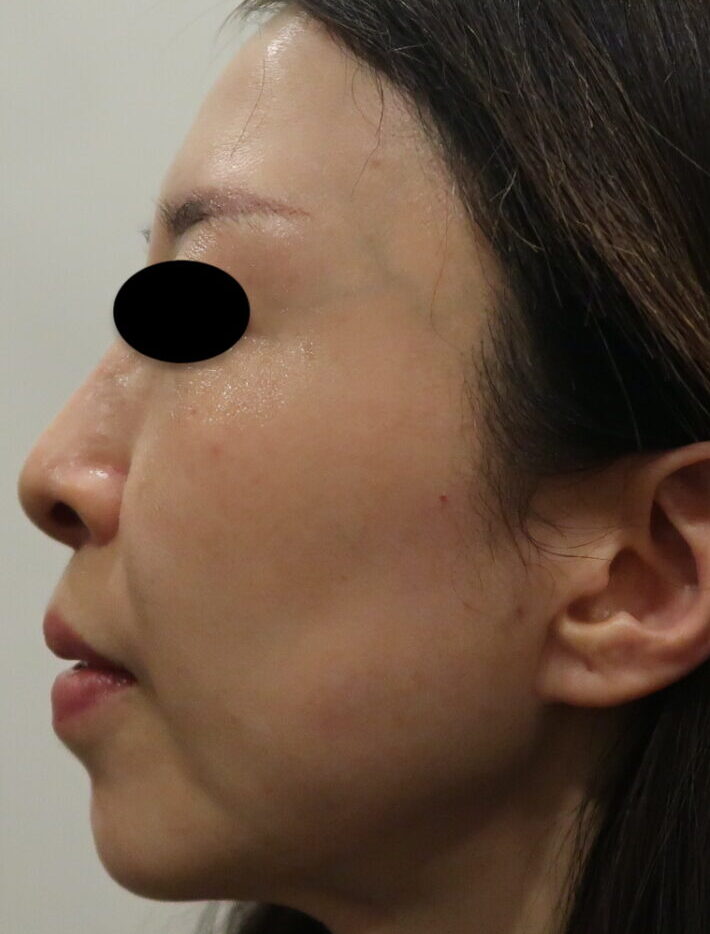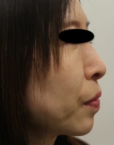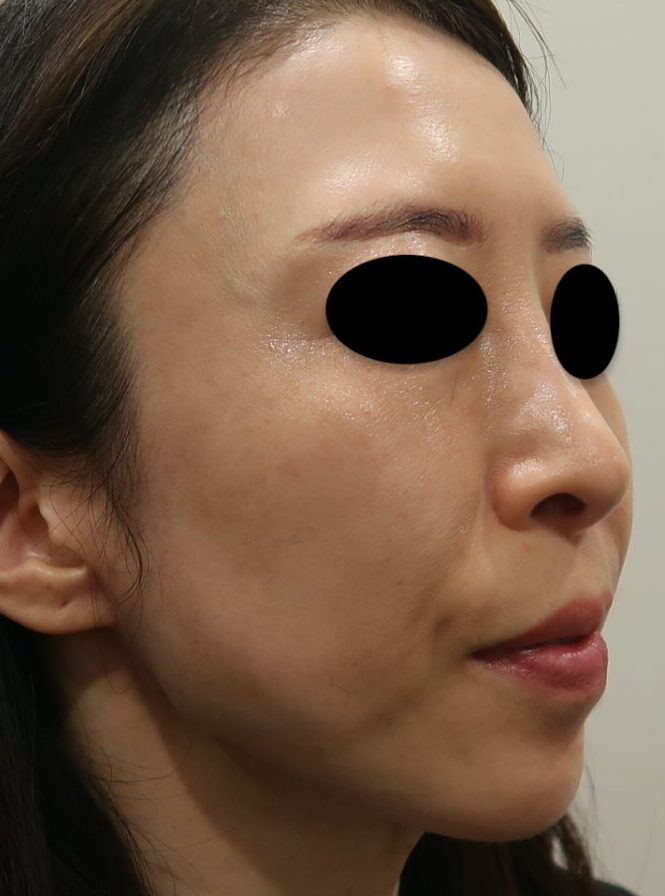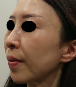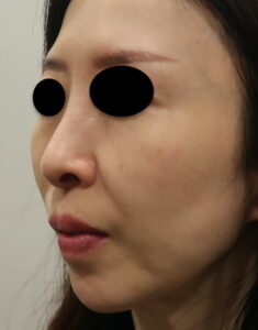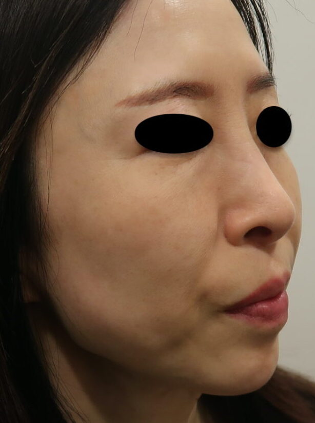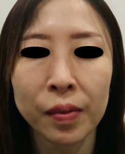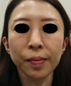 Jowlの膨らみは引き挙げました。Malarに丸みが明るい雰囲気です。クマは埋まりました。鼻唇溝は0.3CC分けたのですが、浅くなり影が薄くなり、窄まっていた線が広がり、明るくなっています。