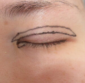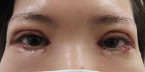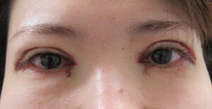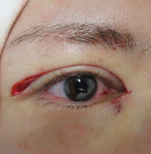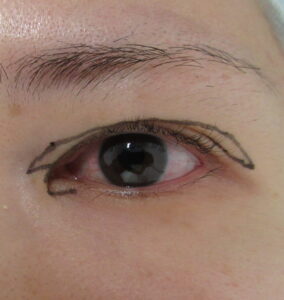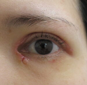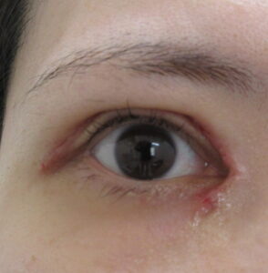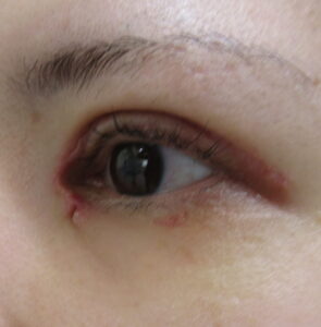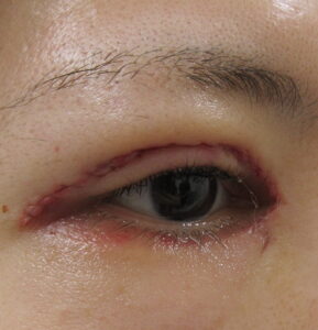 上には術直後の眼瞼部の近接斜位画像。左眼瞼の目頭部は机上の図の右側と似た創の線になっています。蒙古襞が縦に伸びています。