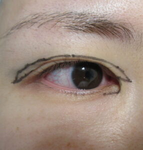 手術に戻ります。目頭を、デザインが消えないようにます#11knife,鋭刃(メスは蘭語)で精密に切開しておきます。続けて眼瞼部をこれもデザインが消えないうちに#15knife,円刃で皮膚だけ切開して、湾剪刀(小さくて私が使うからMory鋏と呼ぶ)で切除します。