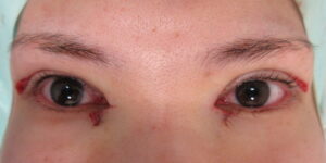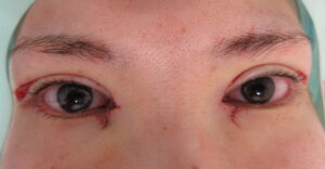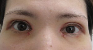 とにかくよく開いています。重瞼ラインも綺麗なカーブを描いています。Z-形成の創痕は赤く見えています