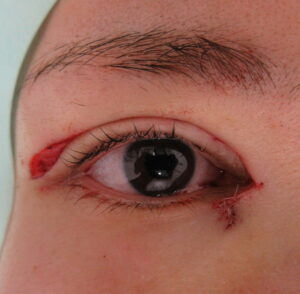 目頭部を縫合後の近接画像。縫合線は机上の図の通りです。