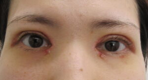 症例は31歳女性。先天性には一重瞼ですから、前葉性眼瞼下垂症です。14年前O.クリニックと7年前T.クリニックで重瞼術埋没法を受けたが外れました。実は他の部分の美容形成医療目的で10年前から当院に罹っていて、4年前に重瞼術切開法を受ける為に他医に罹りました。手術は、他院のラインよりも2.5㎜下のラインで2.5㎜幅の皮膚切除しました。つまりライン幅は同じです。Fernandez法による重瞼固定の上に、さらにK-B-C法で、閉創時にも皮膚と挙筋を連結して癒着を図りました。その後は美容皮膚科治療で私達に罹っていました。