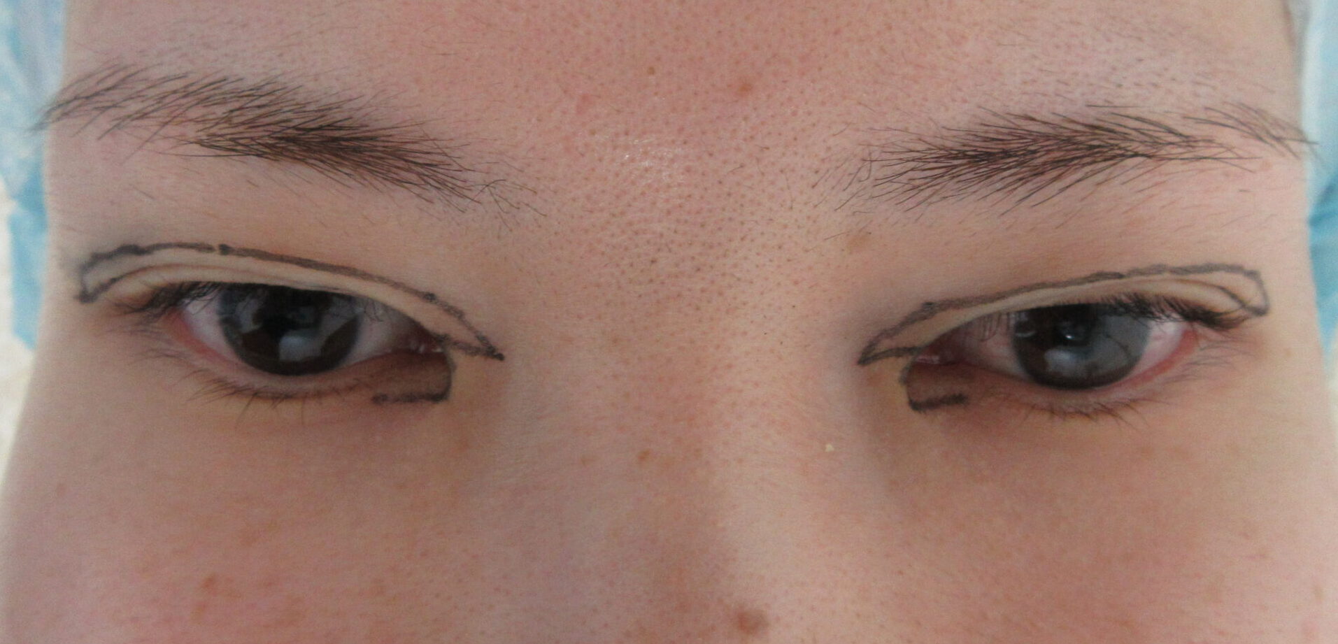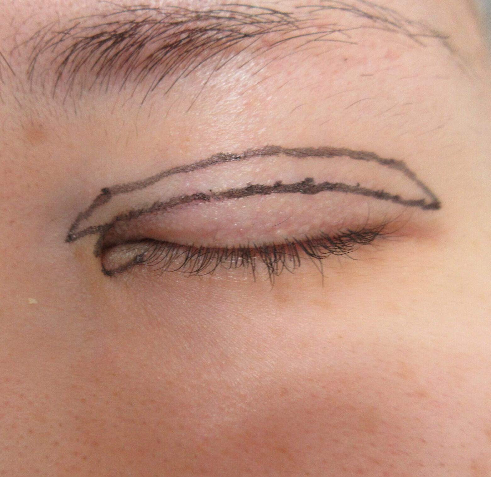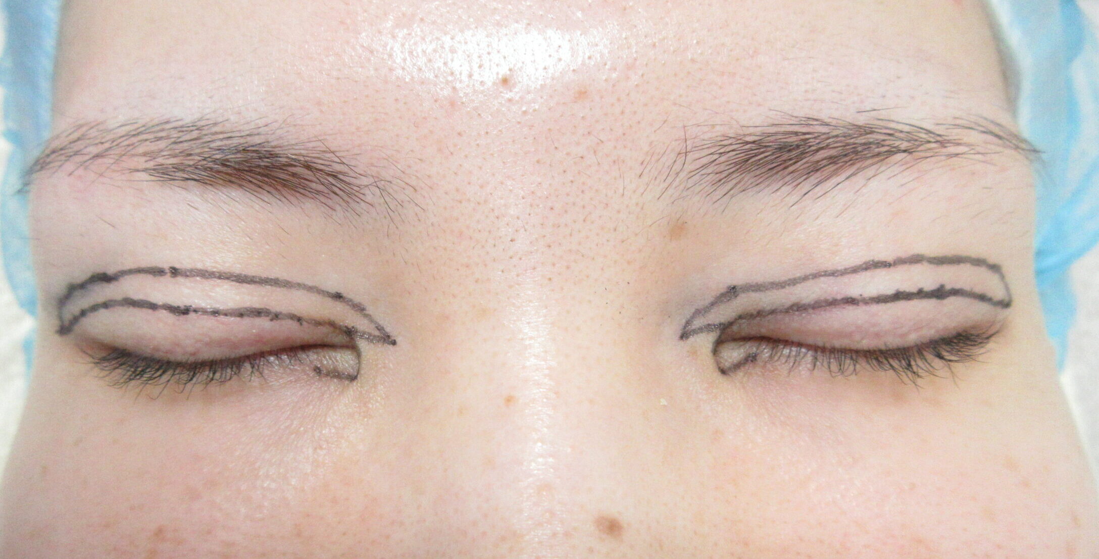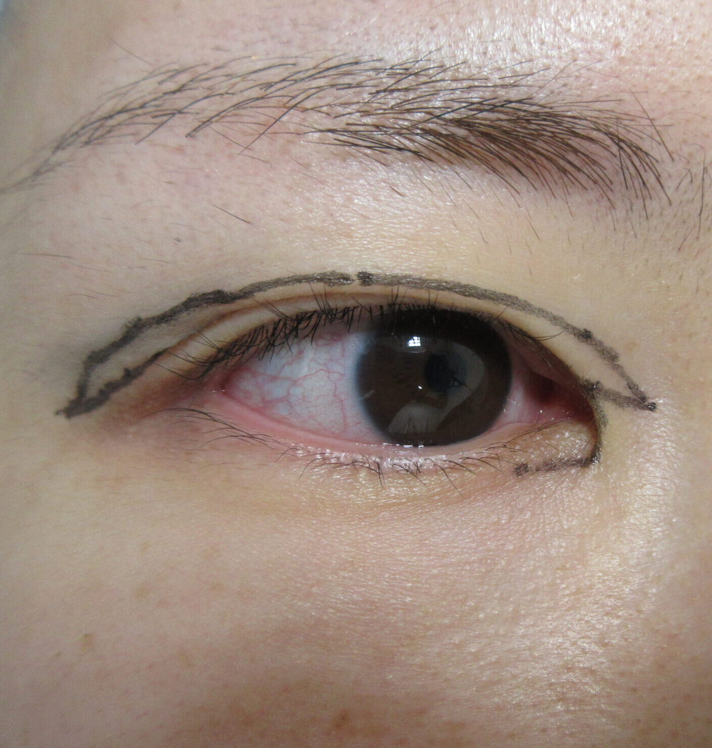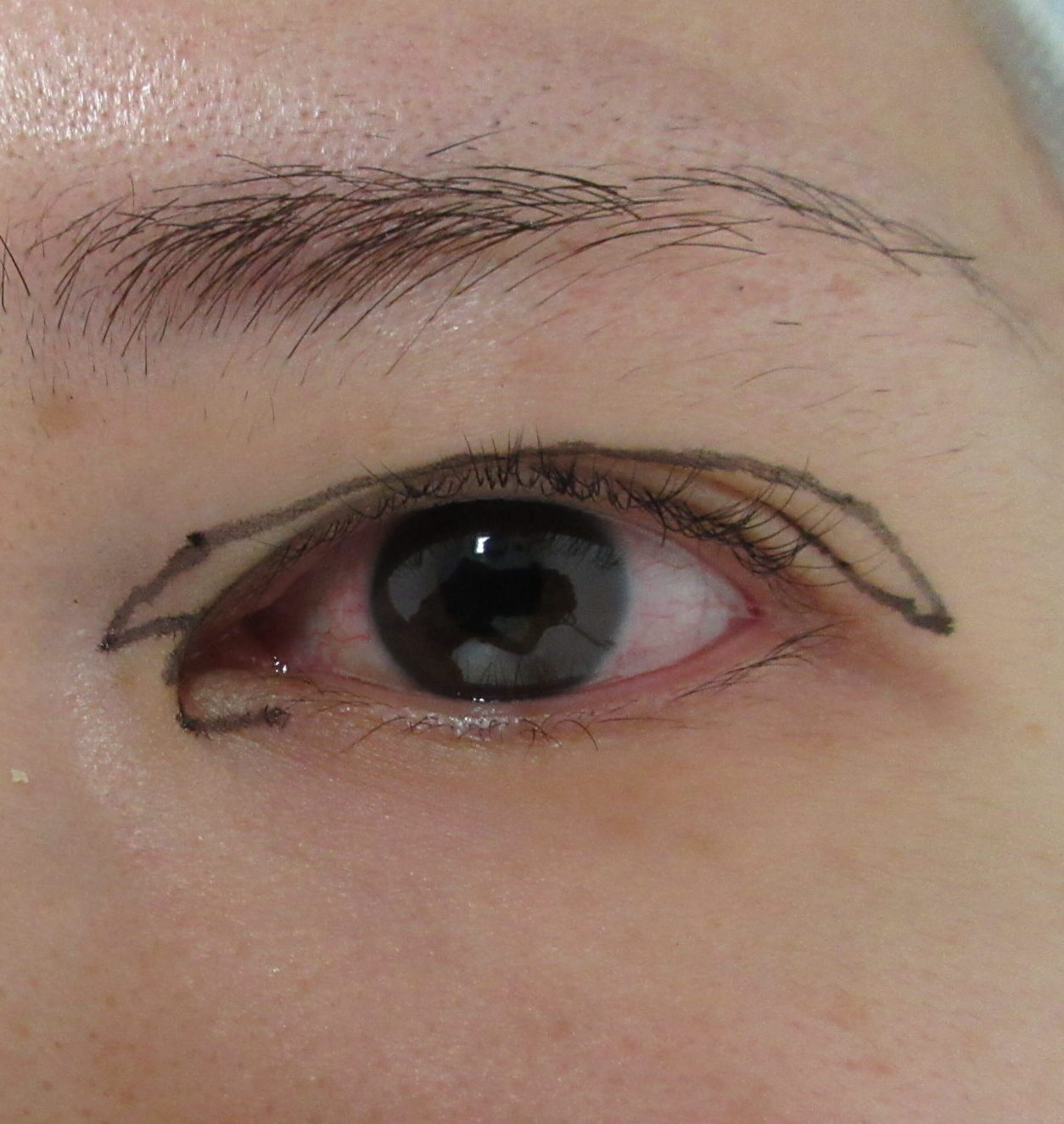 閉瞼時近接画像で視ると、目頭部のデザインが判ります。眼瞼切開(切除)の2本線の内側端を、目頭のZ-形成のデザインの上辺で蓋をするように繋げます。