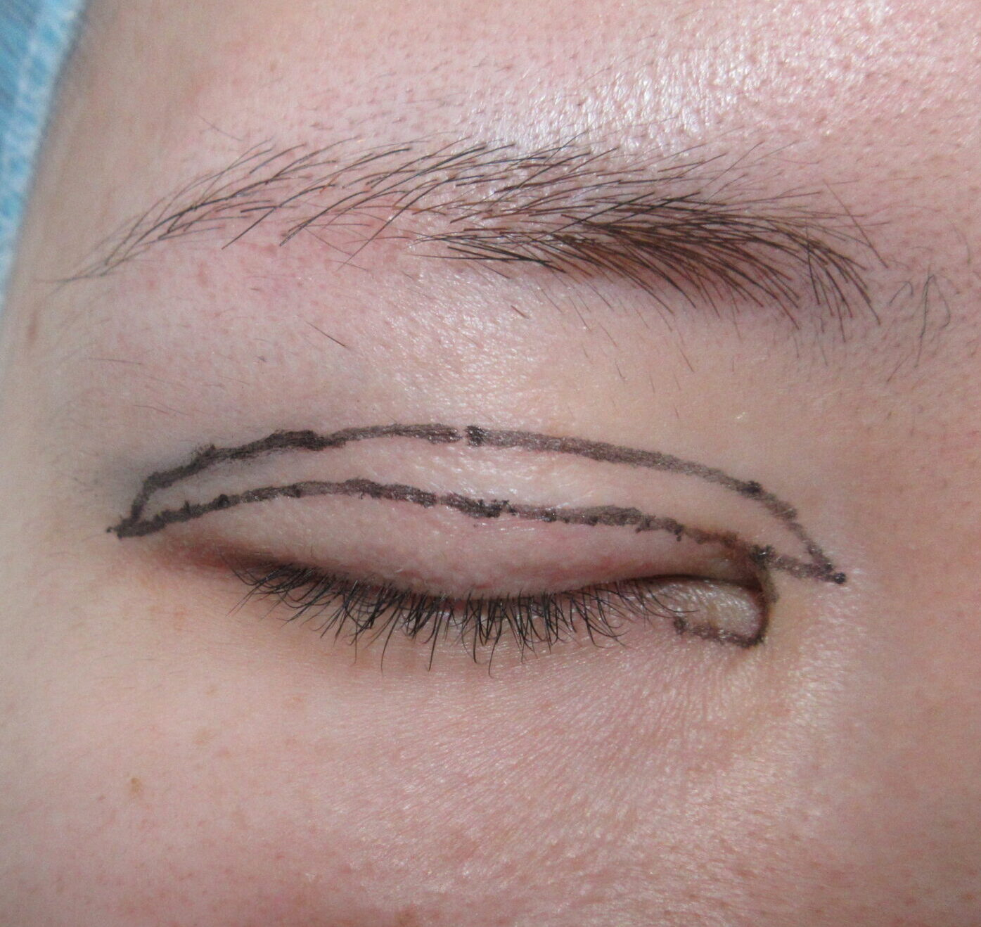 手術に戻ります。目頭を、デザインが消えないようにます#11knife,鋭刃(メスは蘭語)で精密に切開しておきます。続けて眼瞼部をこれもデザインが消えないうちに#15knife,円刃で皮膚だけ切開して、湾剪刀(小さくて私が使うからMory鋏と呼ぶ)で切除します。