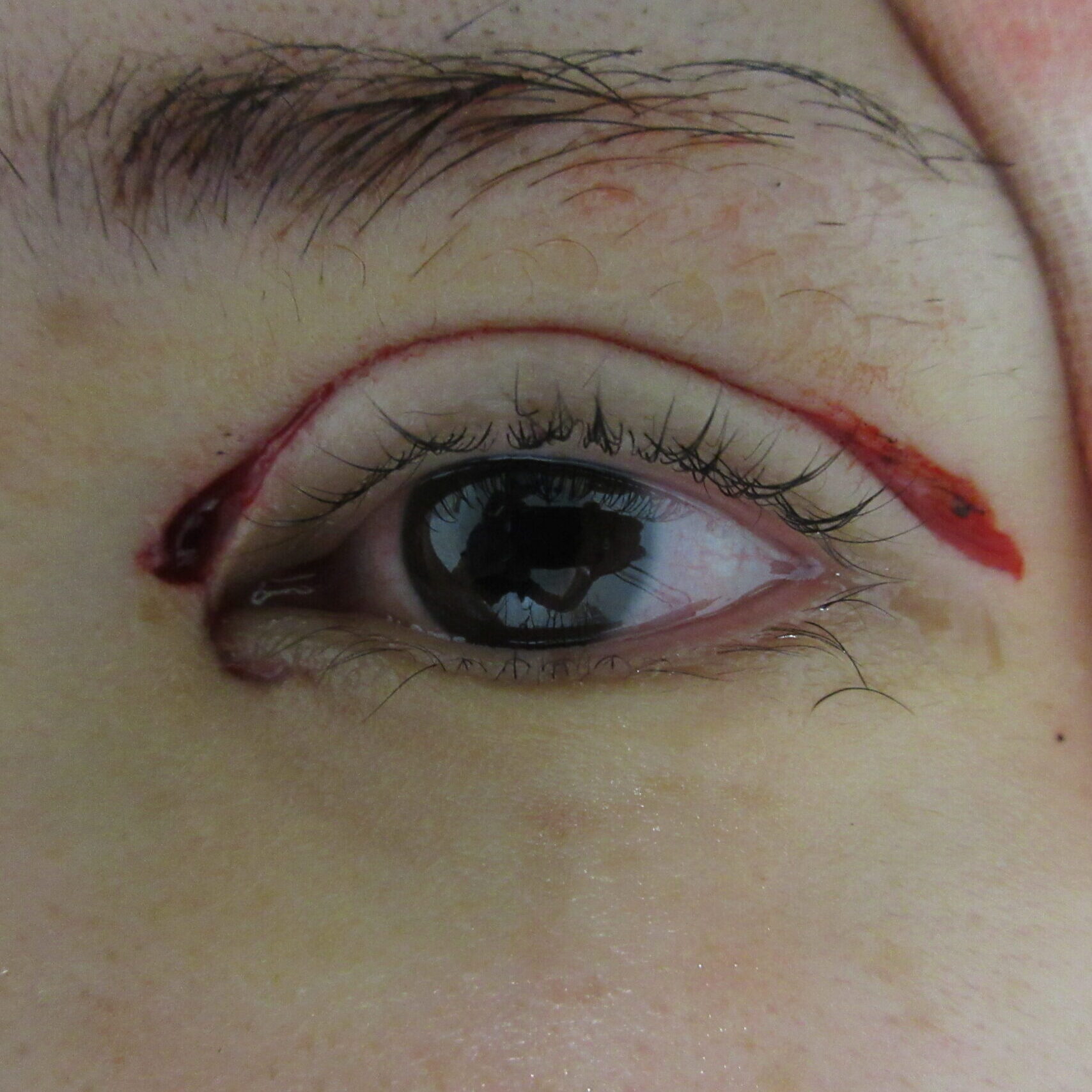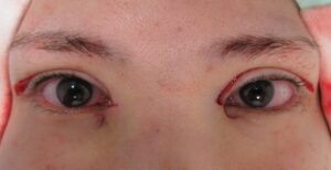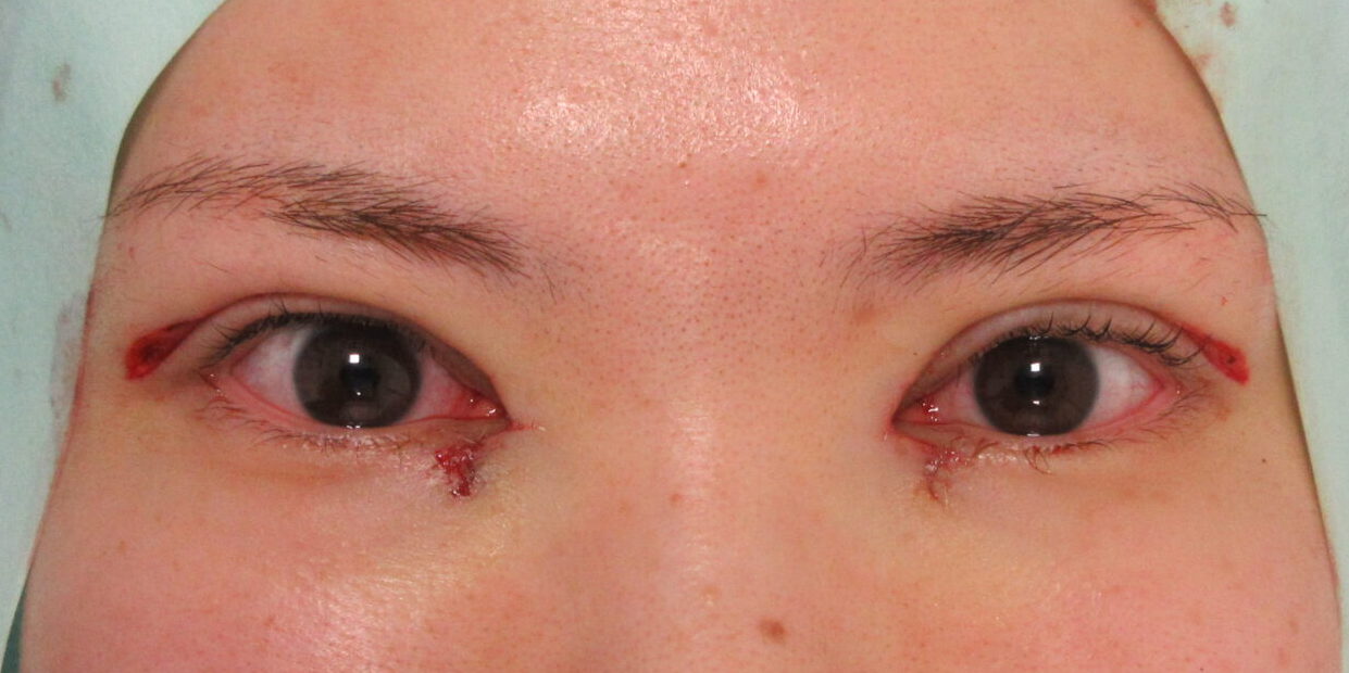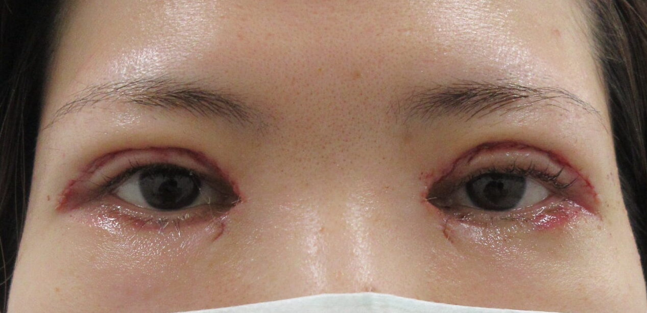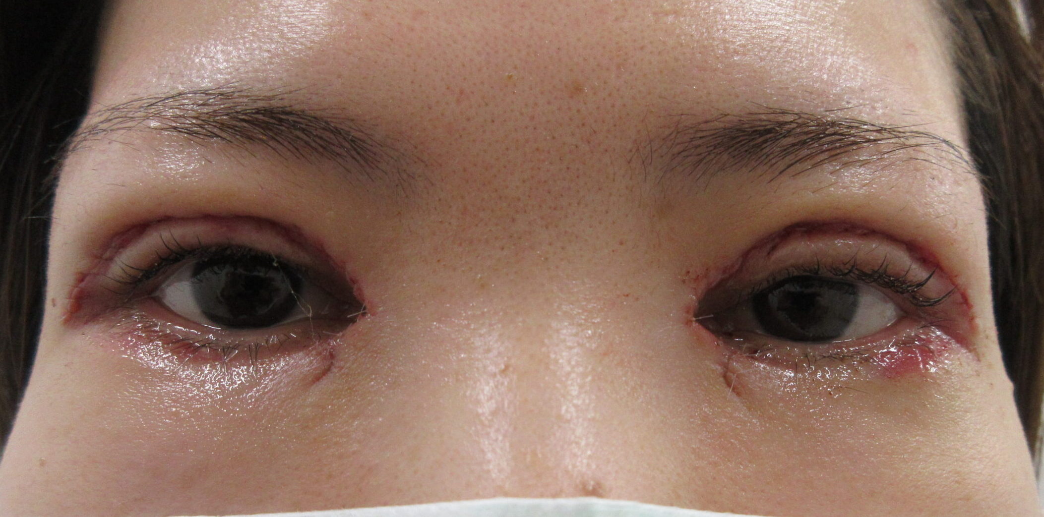 とにかくよく開いています。重瞼ラインも綺麗なカーブを描いています。Z-形成の創痕は赤く見えています