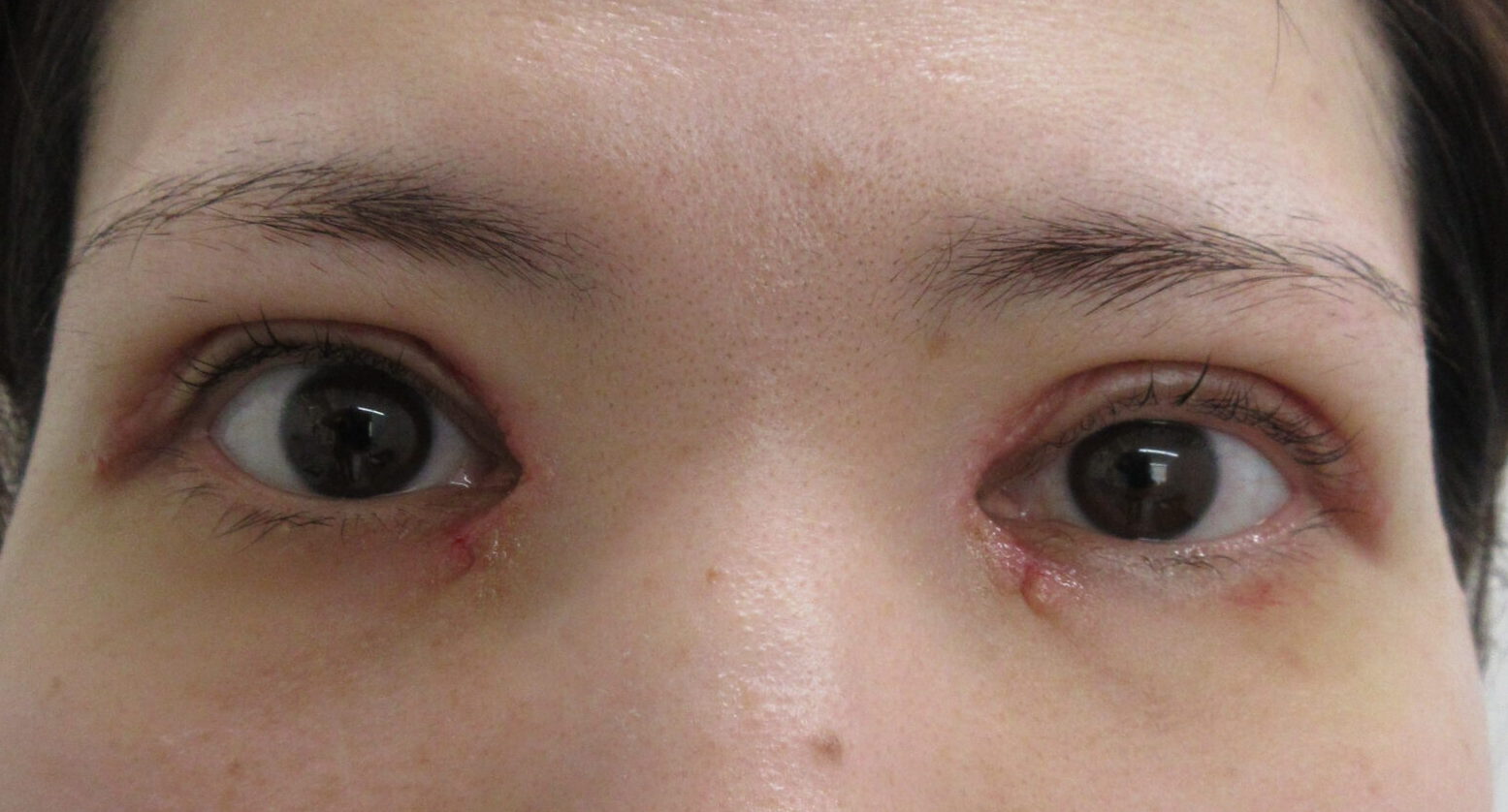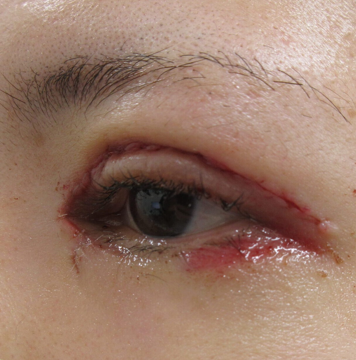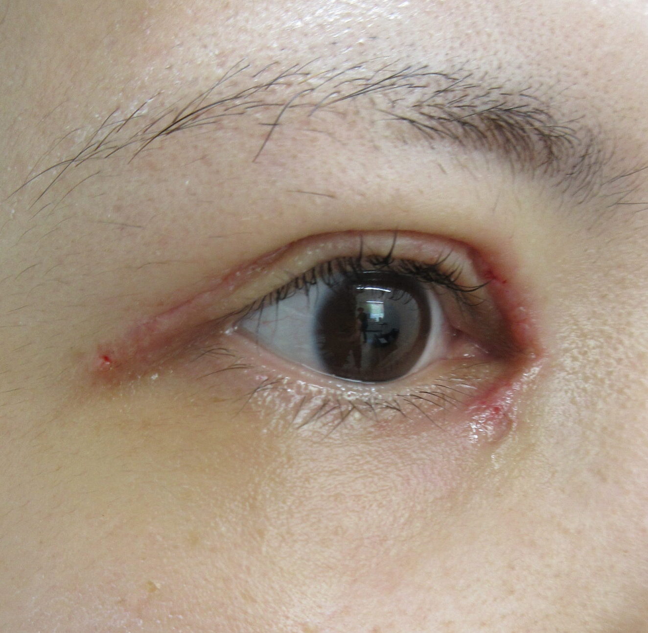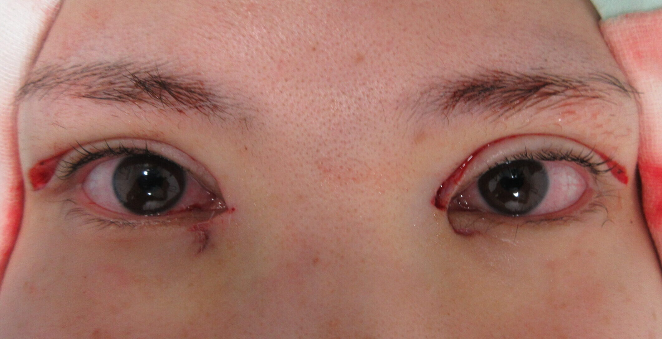 上には術直後の眼瞼部の近接斜位画像。左眼瞼の目頭部は机上の図の右側と似た創の線になっています。蒙古襞が縦に伸びています。