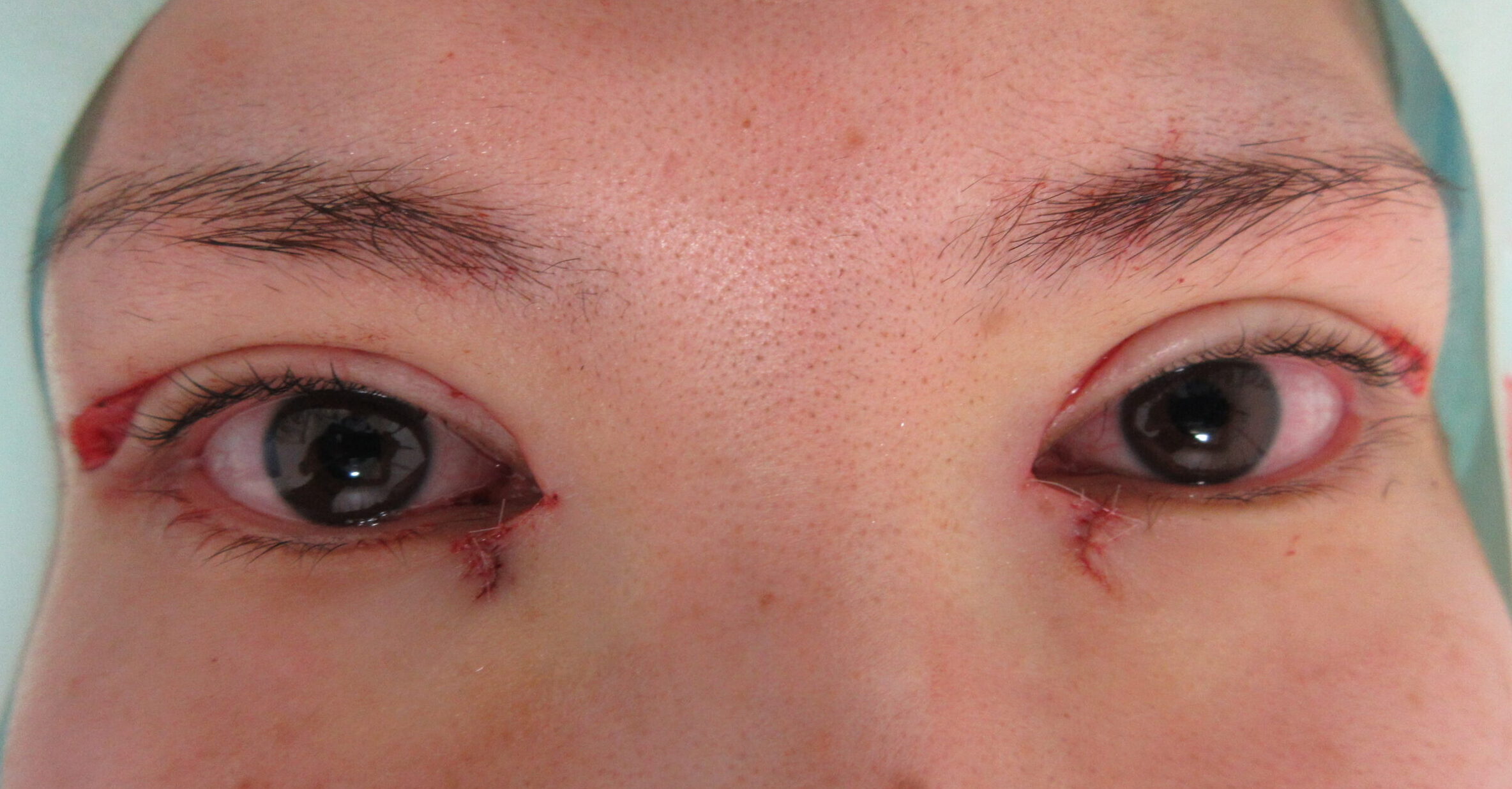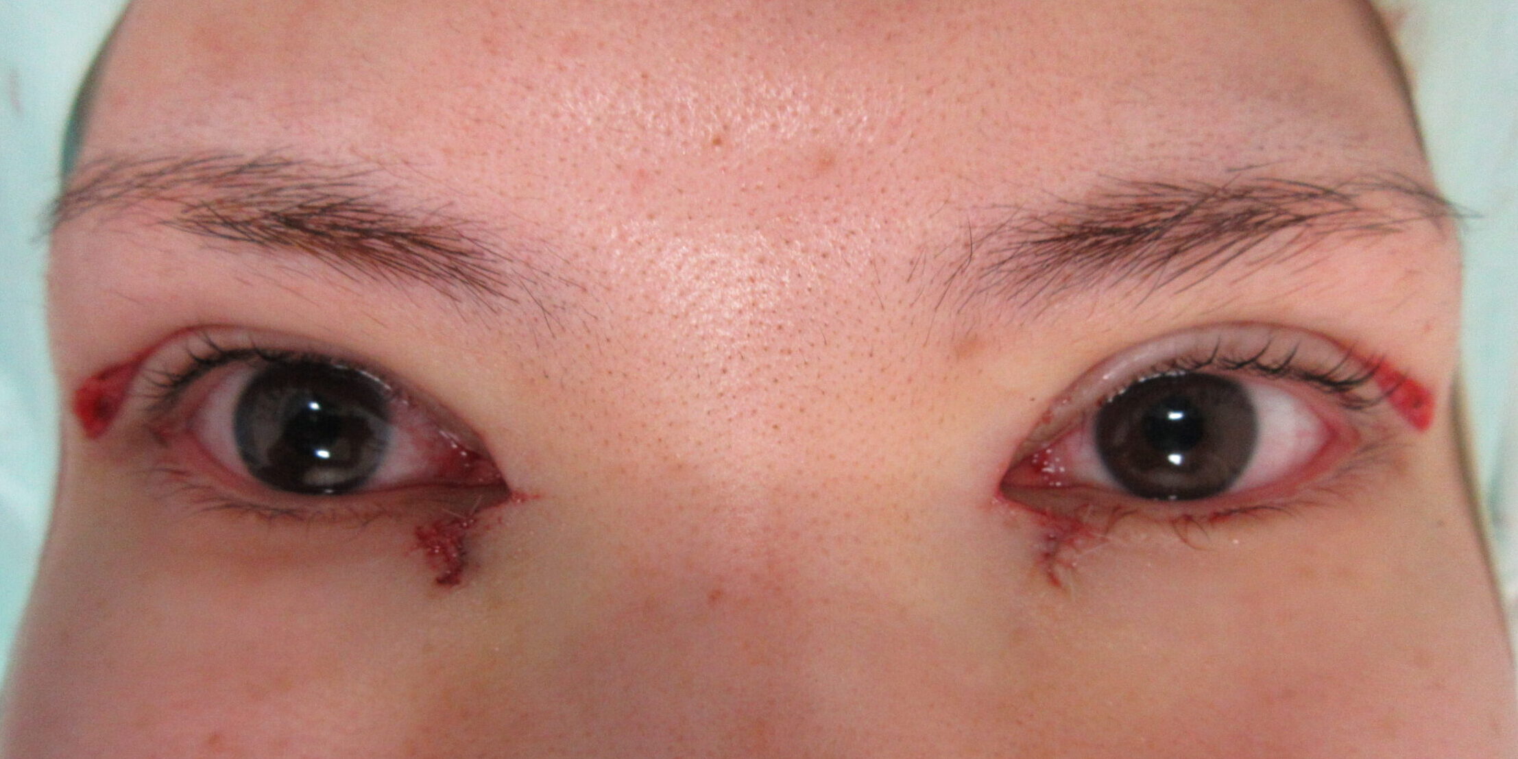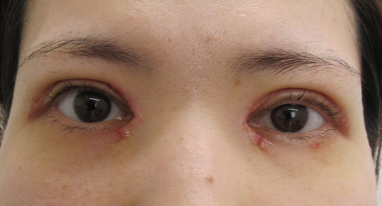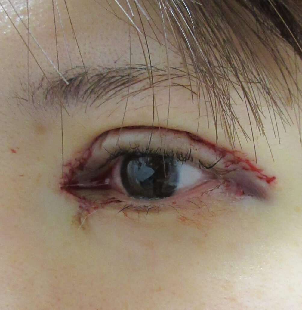 上には術直後の眼瞼部の近接斜位画像。左眼瞼の目頭部は机上の図の右側と似た創の線になっています。蒙古襞が縦に伸びています。