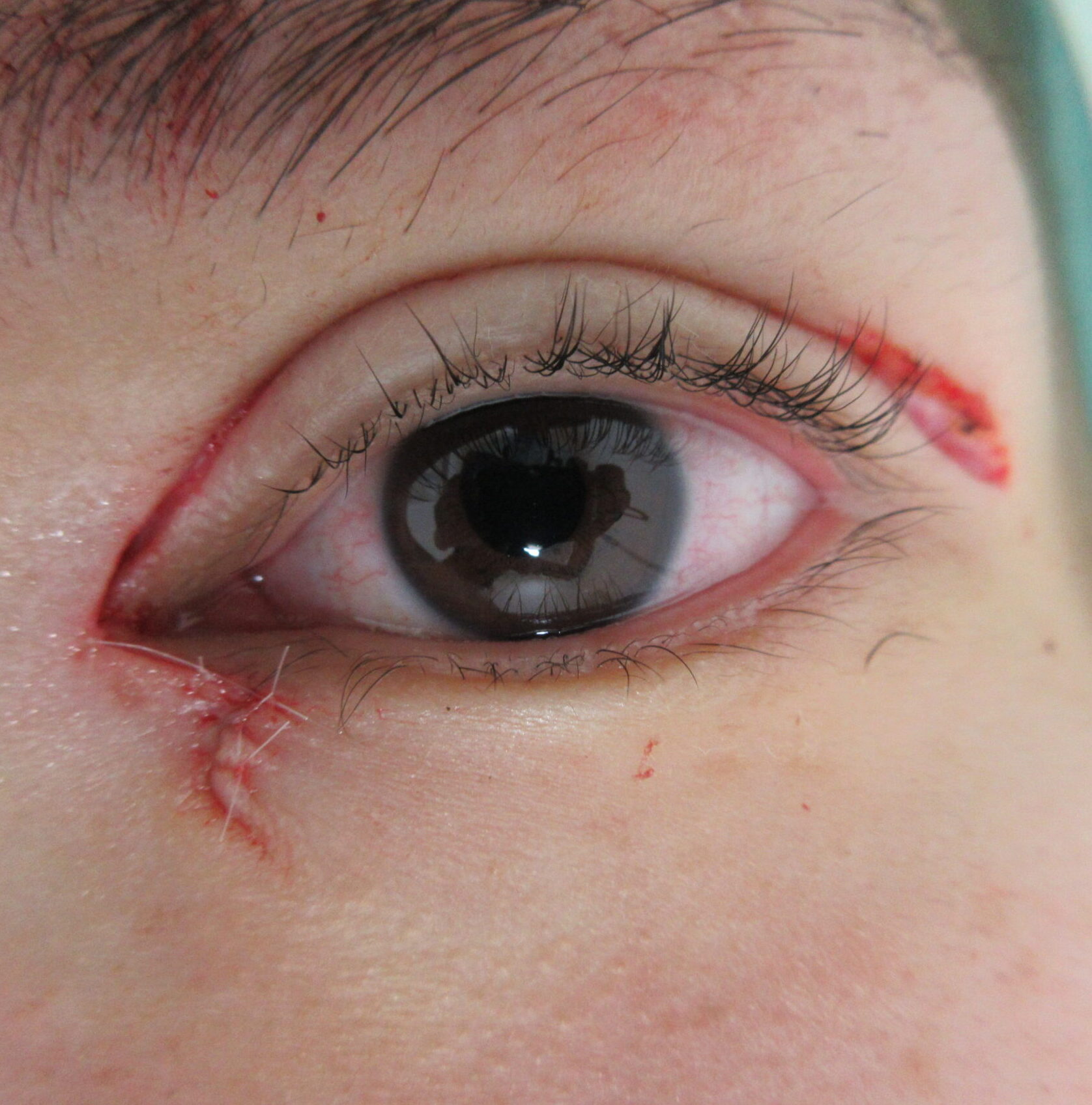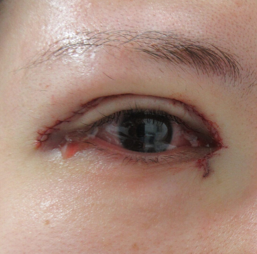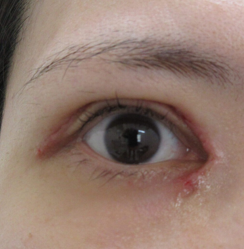 目頭部を縫合後の近接画像。縫合線は机上の図の通りです。