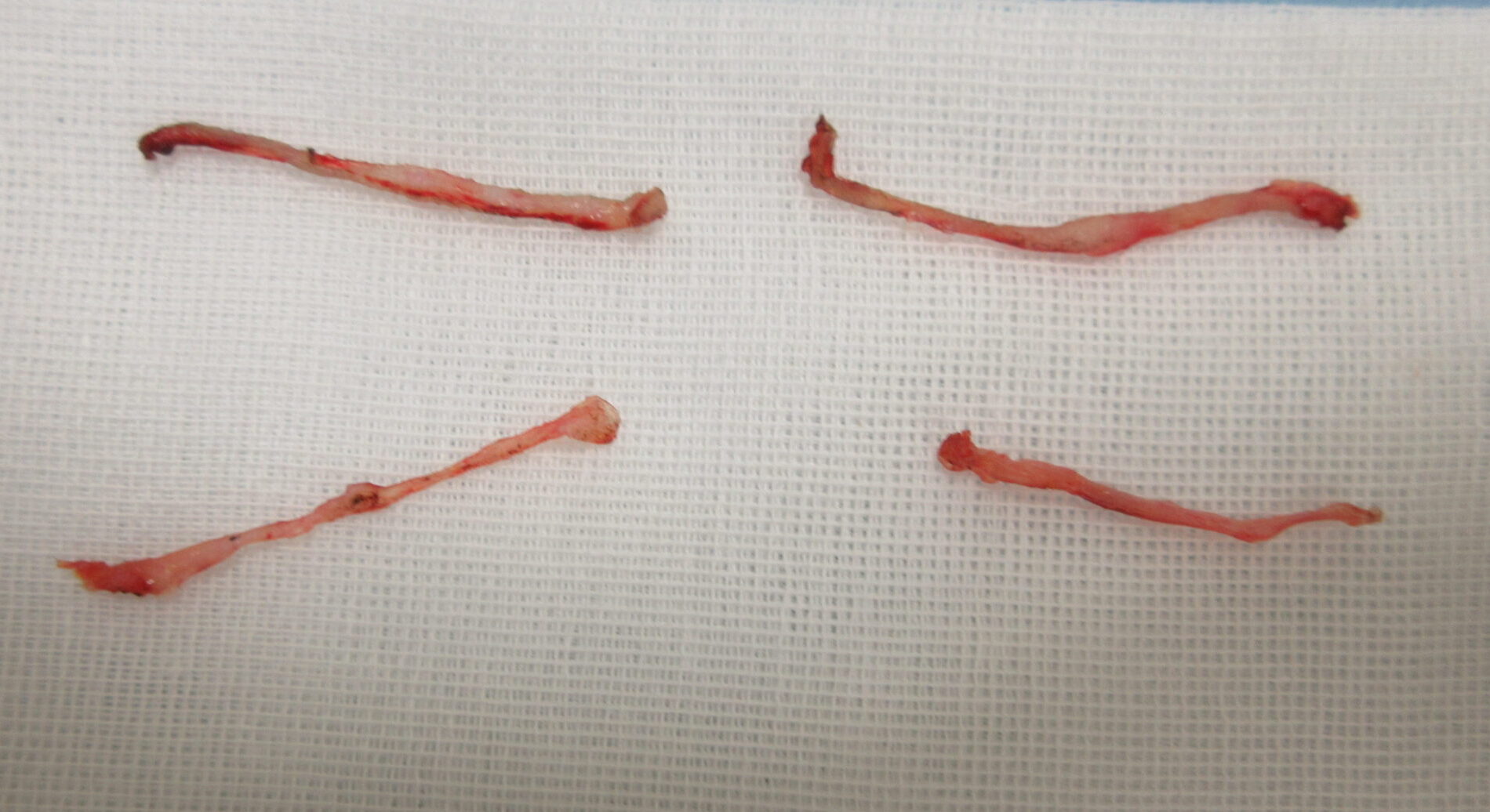 両側眼瞼の目頭切開(形成)創は皮膚を縫合しました。左右共、皮弁先端を二針、他に各辺を合わせて三針縫合しました。そして眼瞼部に戻ります。眼瞼部の眼輪筋も同じ幅で全層をMory鋏で切除します。その後眼瞼挙筋筋膜を露出する為に眼窩隔膜を切開して、はみ出てくる眼窩脂肪を焼灼して、瞼板上縁の挙筋を露出します。上右図は切除した物。上列が皮膚で下列が眼輪筋です。