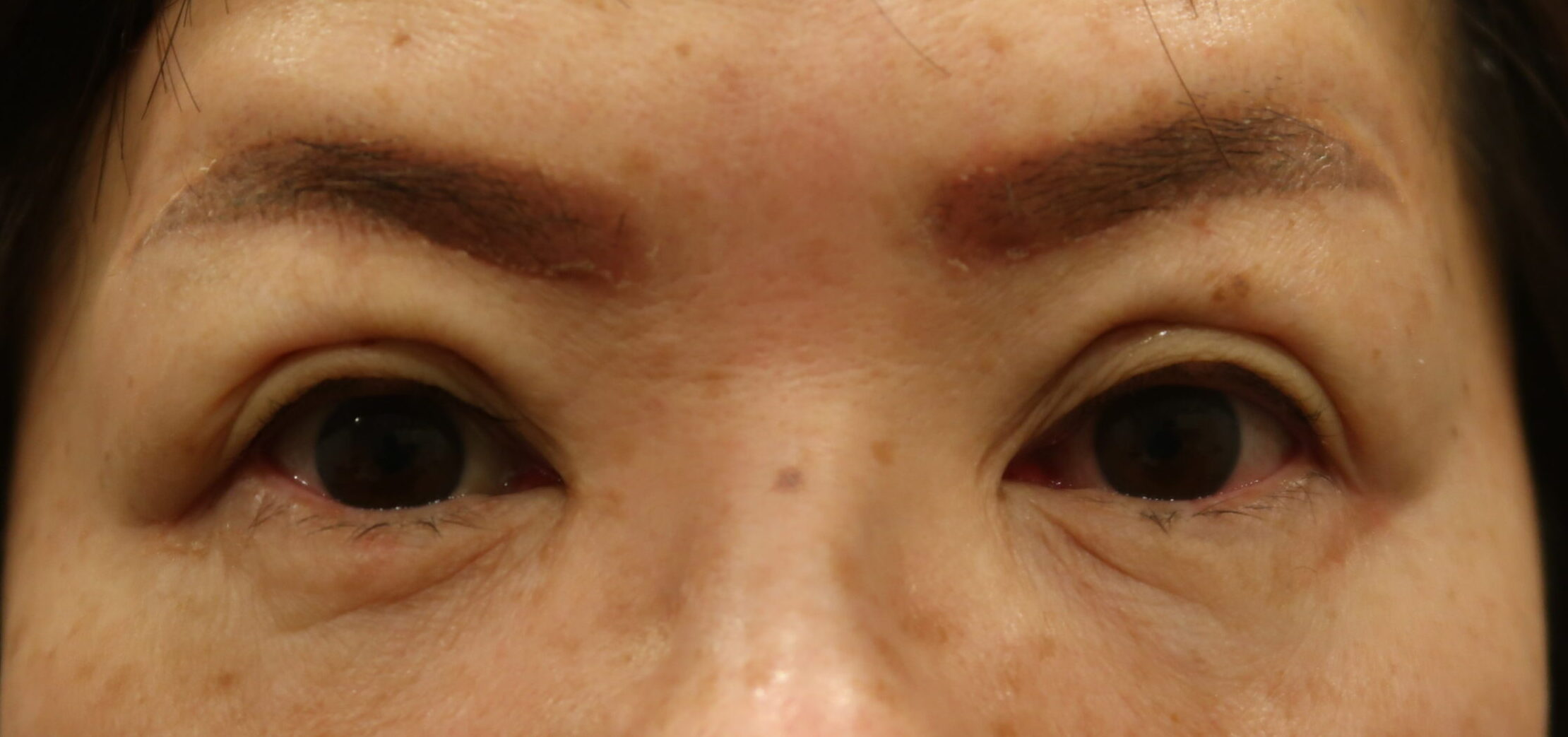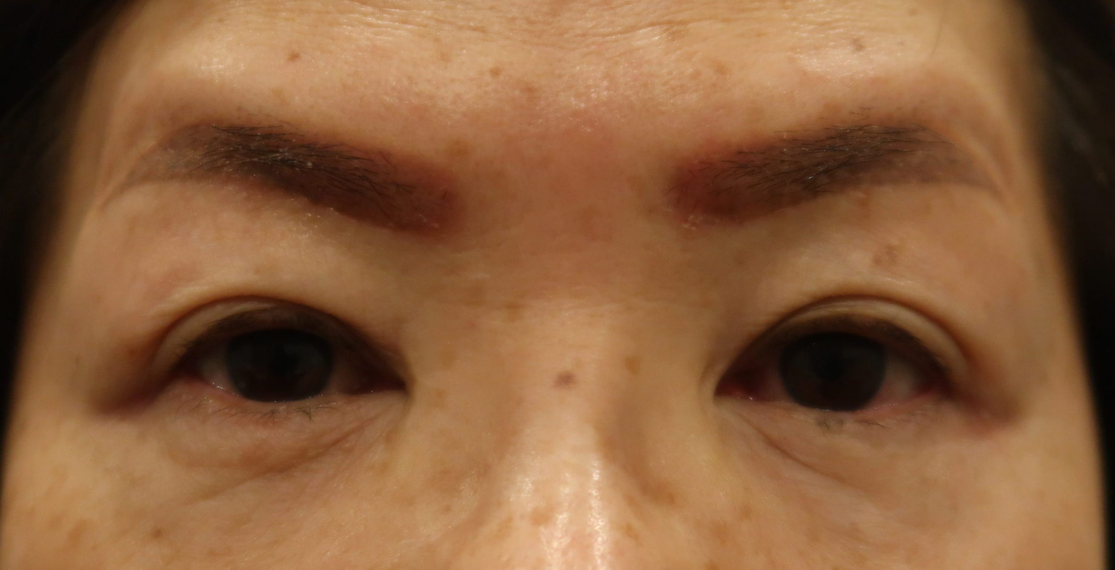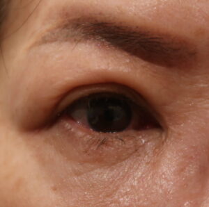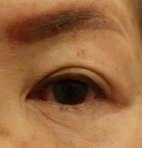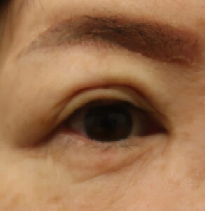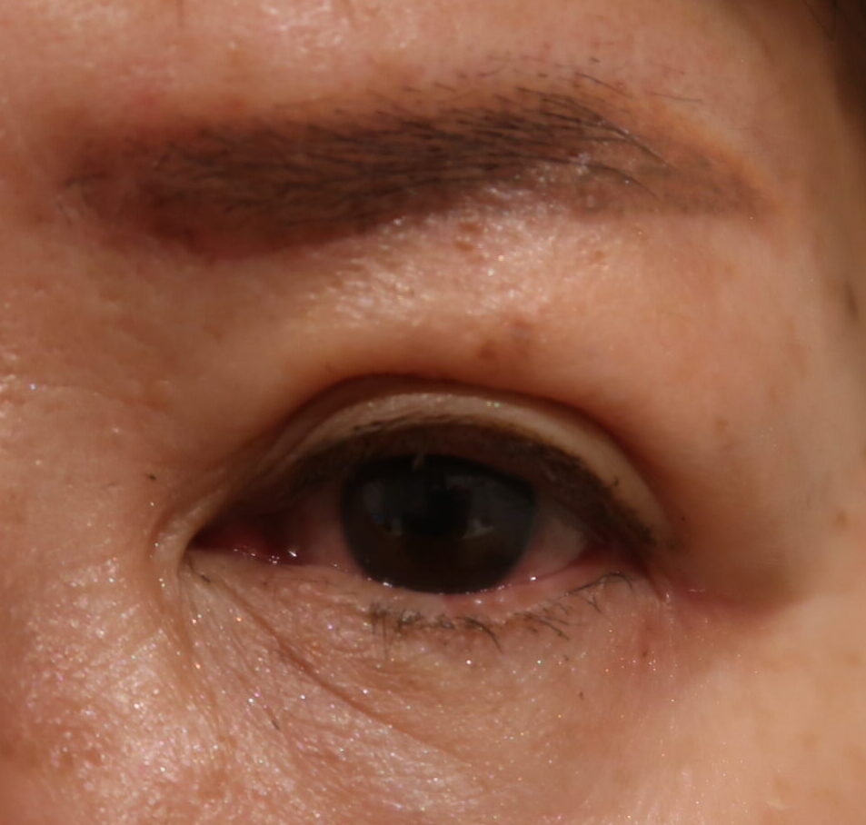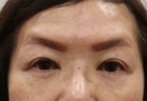 なおボトックスも後日の眉下のためにも、同時に使用となりました。今回の切らない眼瞼下垂手術とボトックスの経過を診て、眉下の手術プランを立てましょう。現時点での予想では、眉を挙げる6㎜切除が適応と考えています。1ヶ月後ですから後段に載せます。また眉下の準備としてアートメイクを入れて来られました。