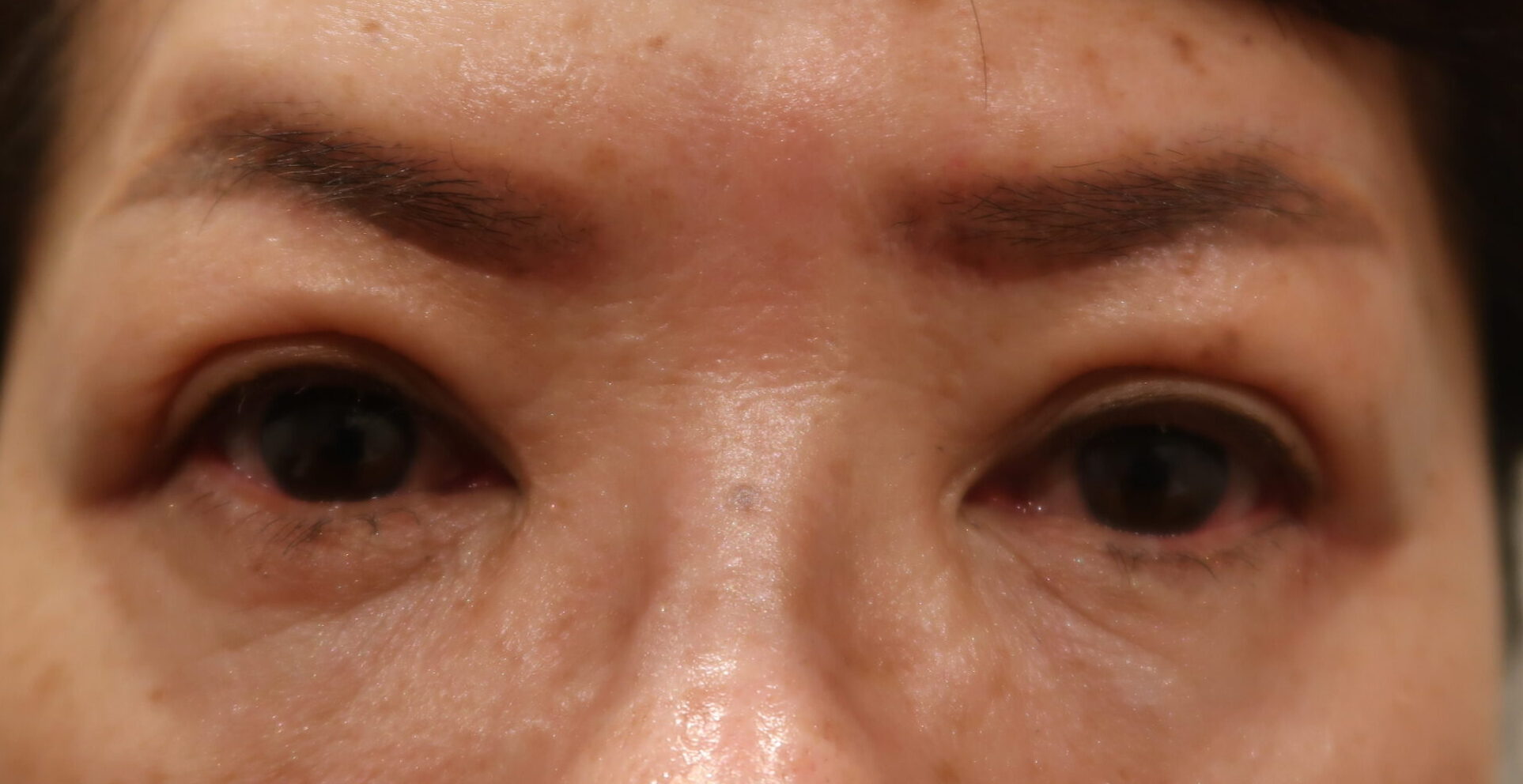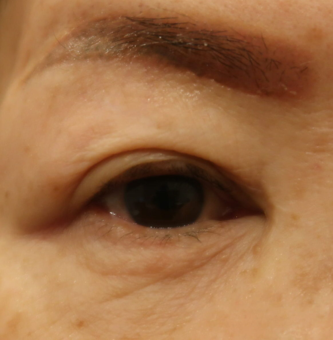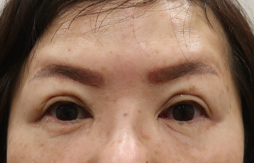 術前は近接画像でも、いわゆる平行型の重瞼を表出していません。前頭筋の収縮に依り、眉毛の外側が吊り上がっている訳で、重瞼も影響されています。