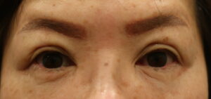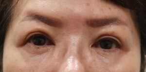 ただし、切らない眼瞼下垂手術で瞼縁が挙がって前葉は少々の向上ですから、弛んでいます。目元が濃いです。なお、涙袋を希望されていましたが、上下とも濃くするとしつこい感じになるので、「眉下後にしましょう。」となりました。