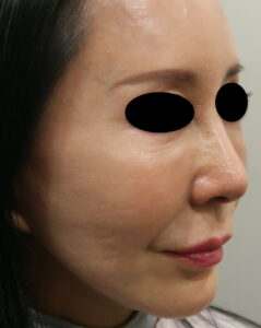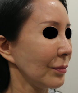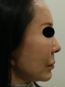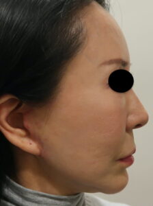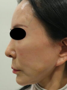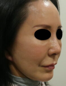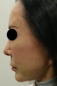 上左図は手術直後。まだ左側(向かって右)の局所麻酔が切れていない為、口が落ちていますが、下顎縁のカーブは術前と比べて綺麗です。少し時間を置いて局麻がある程度切れてから、もう一度撮影しました。下顎縁のカーブにまだ差があります。