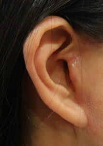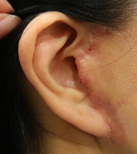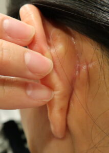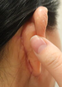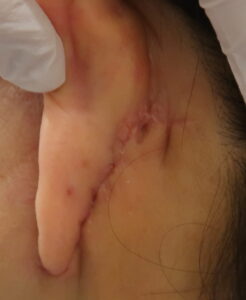 上下四葉は術後10日での耳介部周囲。耳珠部と耳後溝線を除いて抜糸しました。