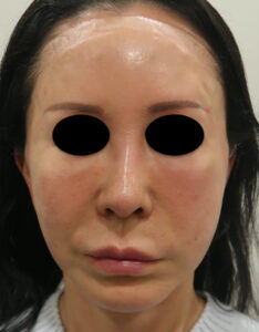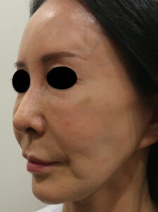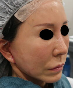 術後1ヶ月で血種の跡の瘢痕化した硬結が診られました。今回は直ちにステロイド局注をしました。軟化しましたが直ぐには見えなくなりません。