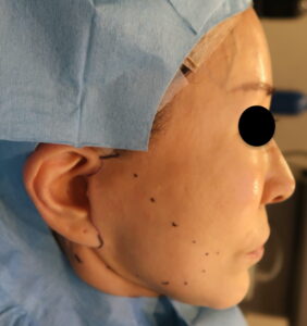 上左図は術前。上右図は手術直前のデザイン後。Jowl が垂れてはいませんが、下顎縁のカーブが綺麗な曲線では無いのは嫌なのです。