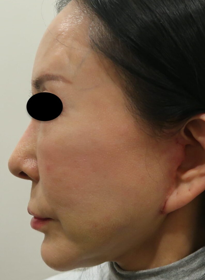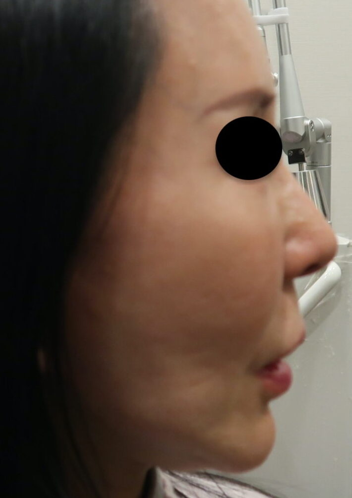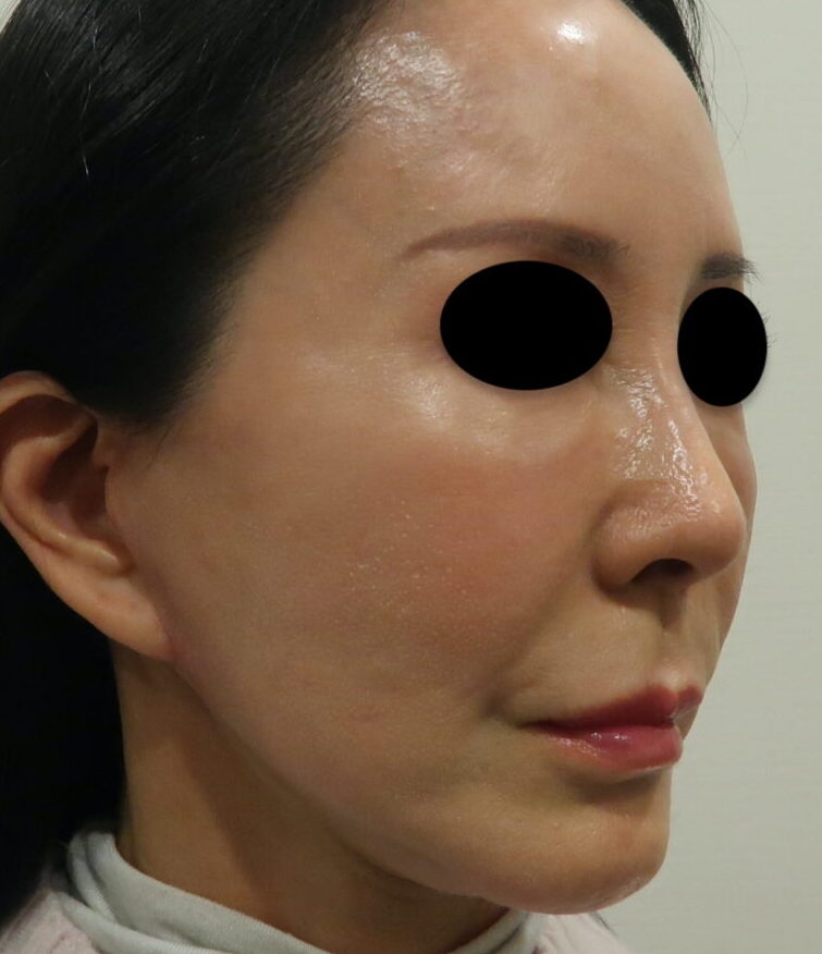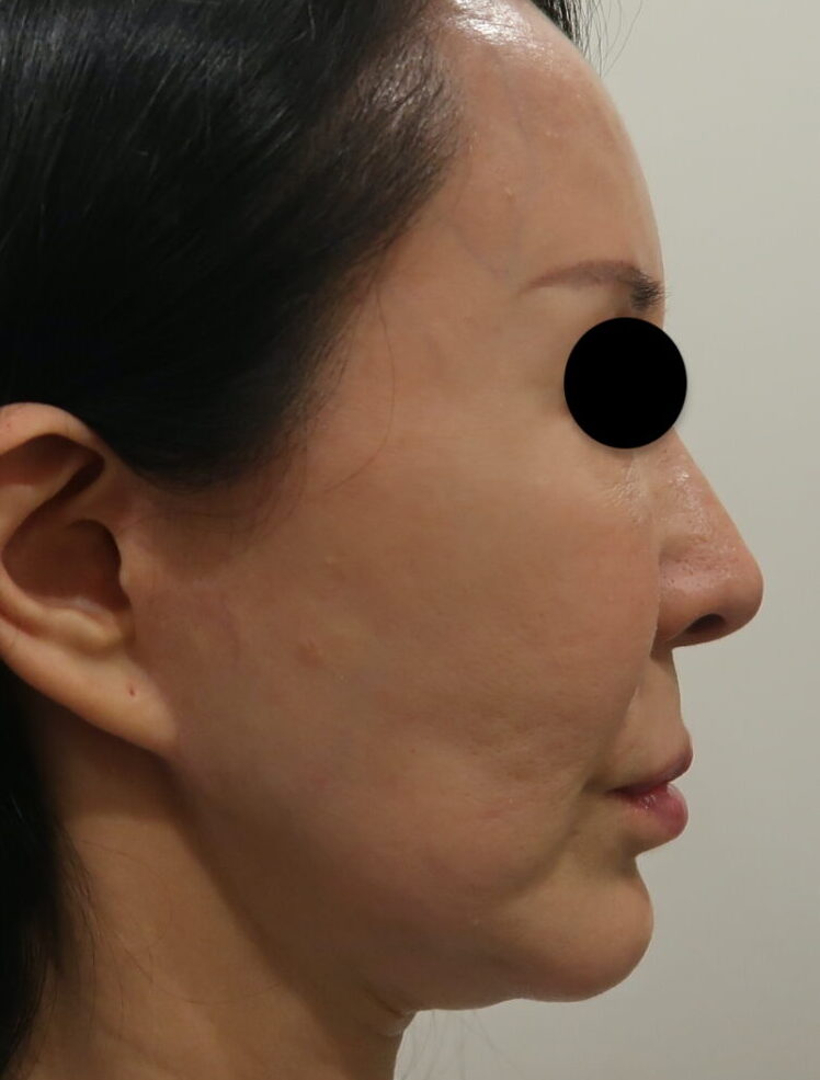 上左図は手術直後。まだ左側(向かって右)の局所麻酔が切れていない為、口が落ちていますが、下顎縁のカーブは術前と比べて綺麗です。少し時間を置いて局麻がある程度切れてから、もう一度撮影しました。下顎縁のカーブにまだ差があります。