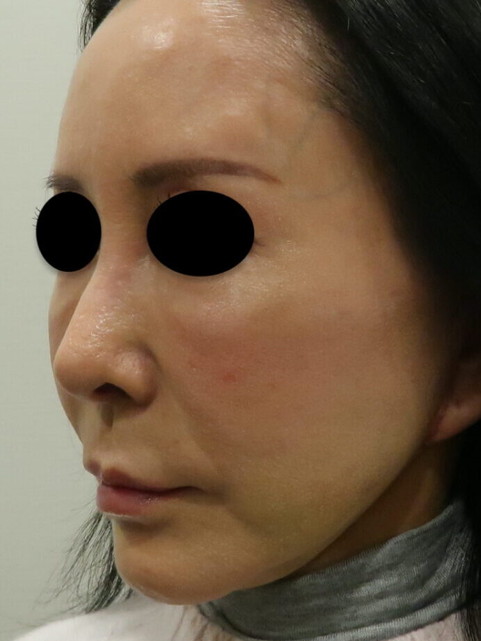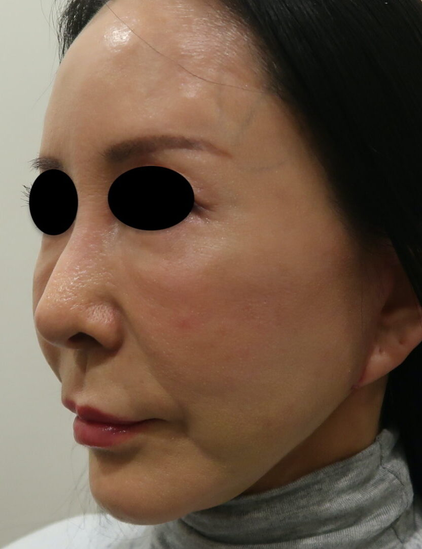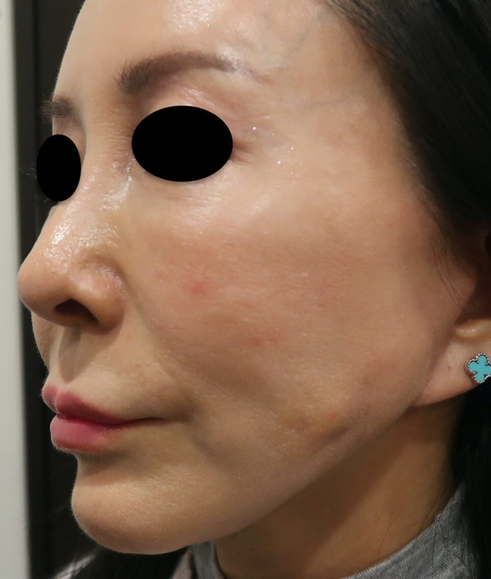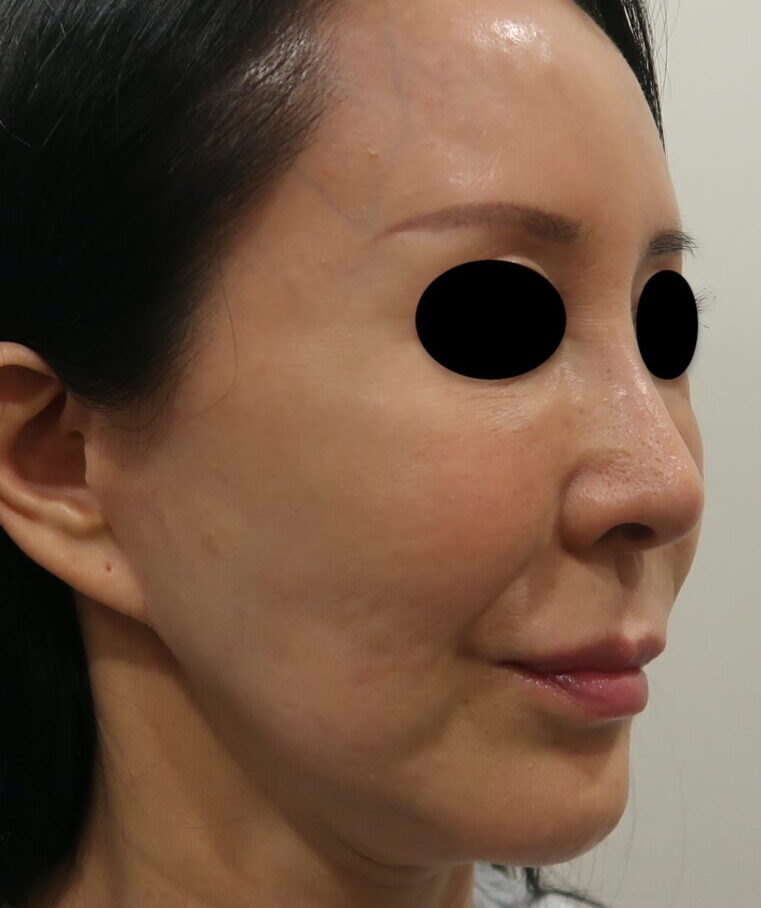 上左図は手術直後。まだ左側(向かって右)の局所麻酔が切れていない為、口が落ちていますが、下顎縁のカーブは術前と比べて綺麗です。少し時間を置いて局麻がある程度切れてから、もう一度撮影しました。下顎縁のカーブにまだ差があります。