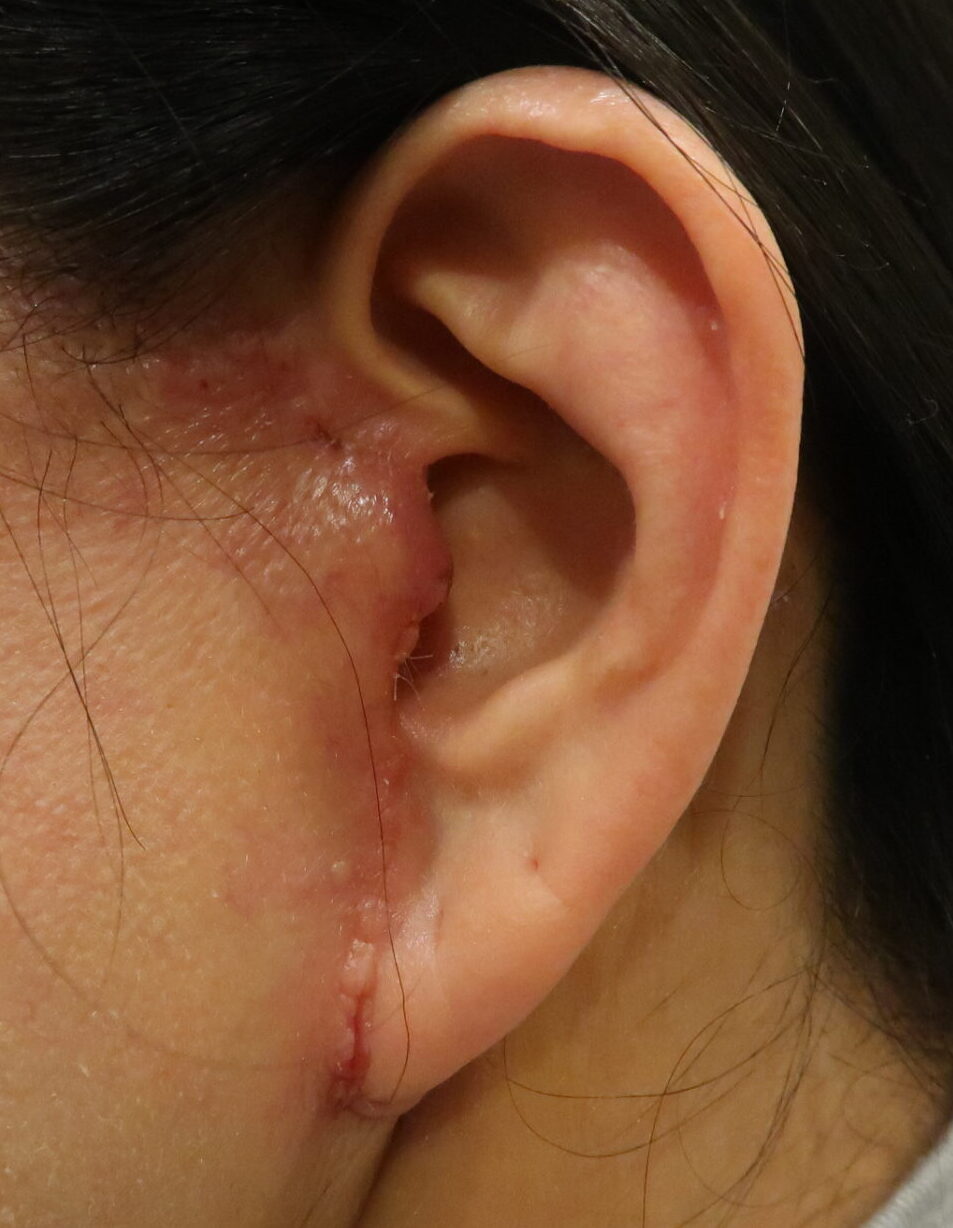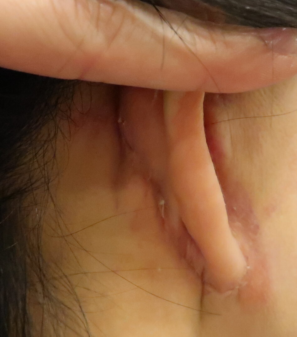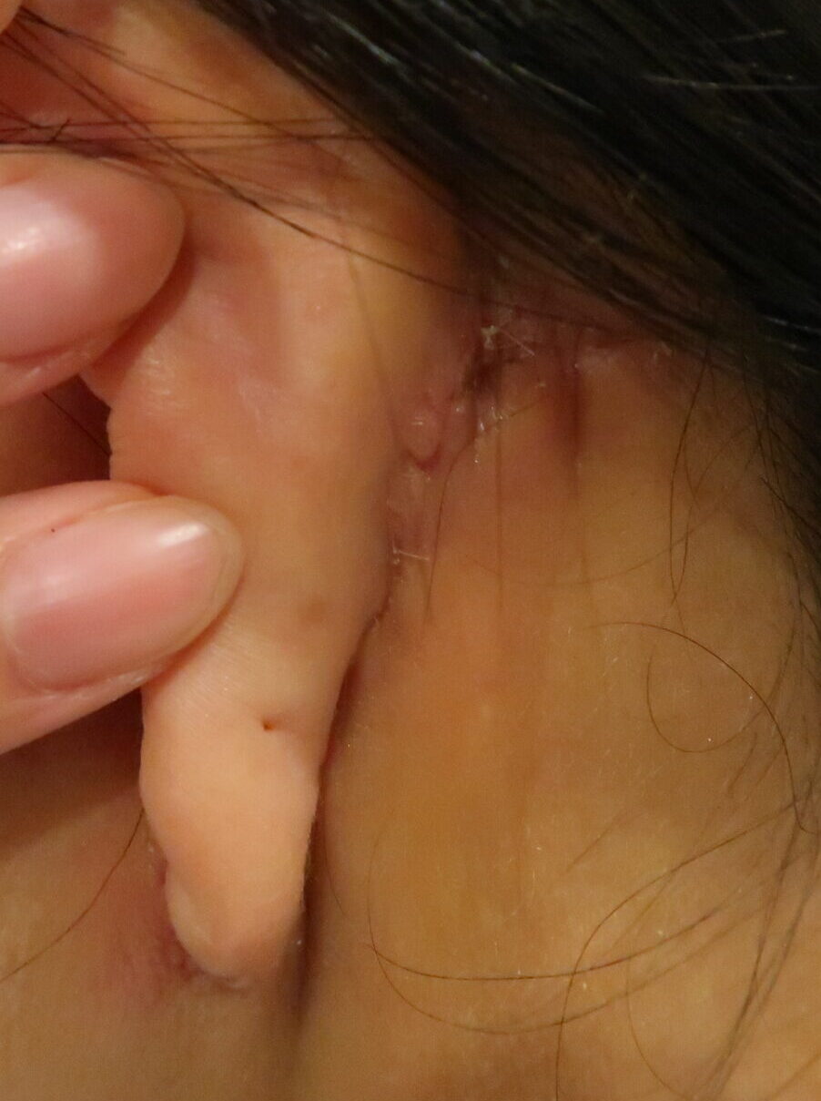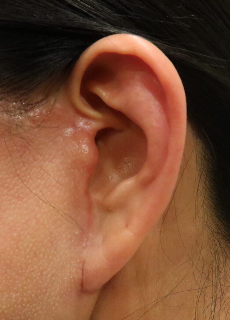 上下四葉は術後10日での耳介部周囲。耳珠部と耳後溝線を除いて抜糸しました。