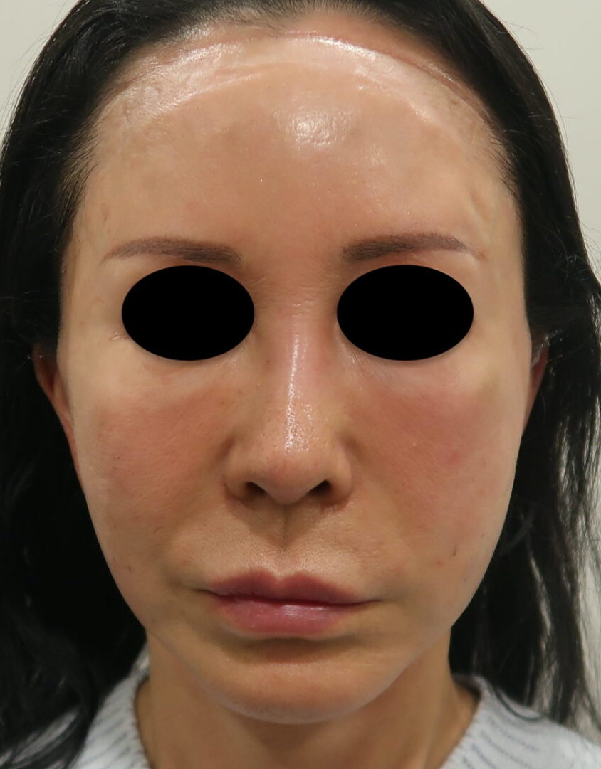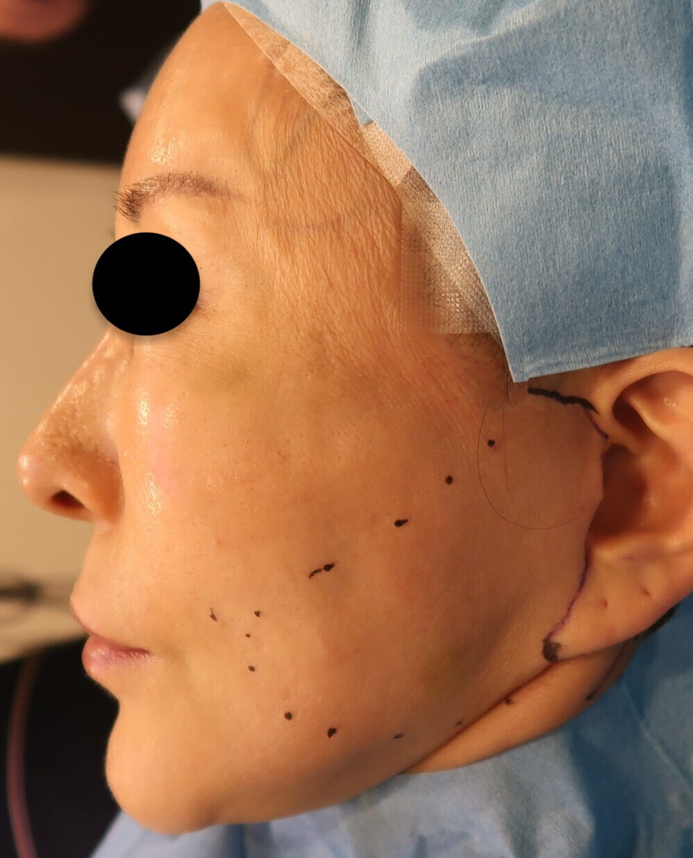 その後は年に数回何らかの美容医療を施して来て、1年前には「他院で咬筋(人間には無いエラ)ボトックスとスレッドリフトを併用したら、余計にJowlが垂れました。」との事で、私がもう一度スレッドリフト【3Dlift+コグ】で挙げたしました。直後に2回目の眉下切開手術を施行しました。その経過も含め、昨年末来院されました。いきなり「先生!。ブログに何回もリフト手術した方いるって書いていますよね?!。5年ごとの人も居るんでしょう?。出来るなら私ももう一度先生にお願い!。」と有難いお言葉を頂きました。私「合わせて3回目でしょう。書いた通り8回リフト手術をした患者さんも居ますよ。」と強弁して、「同じ切開で同じ剥離ですが、9年経ているから楽に切れます。」と豪語しました。
