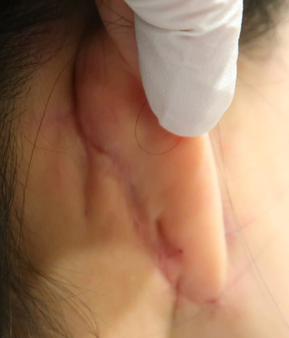 耳後溝の創痕は見えない部ですが、癒合が遷延しますから、2週間待ちます。