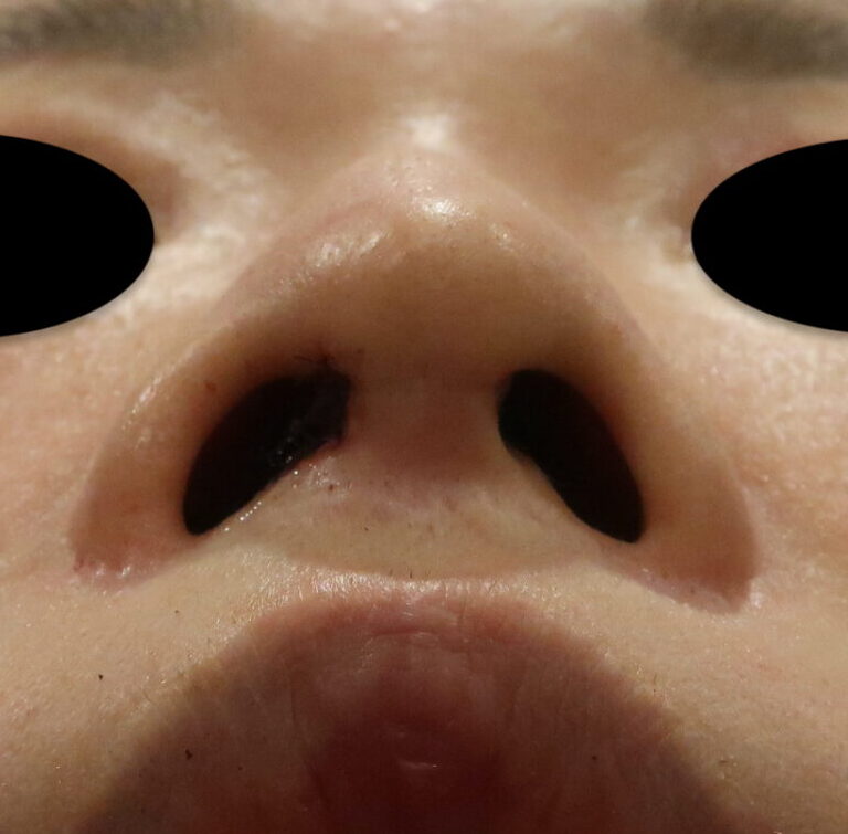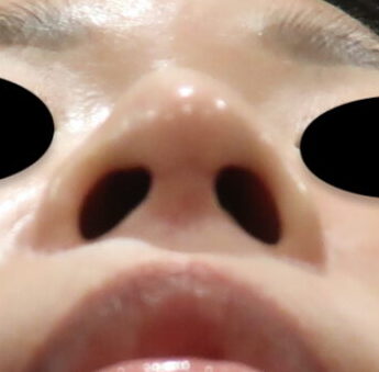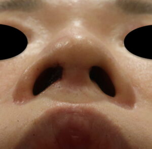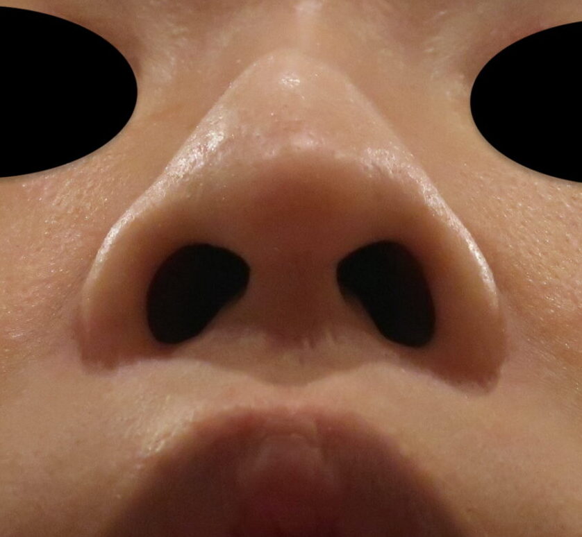 手術直後です。正面像でも違います。煽り画像では鼻尖から鼻陵まで見えます。